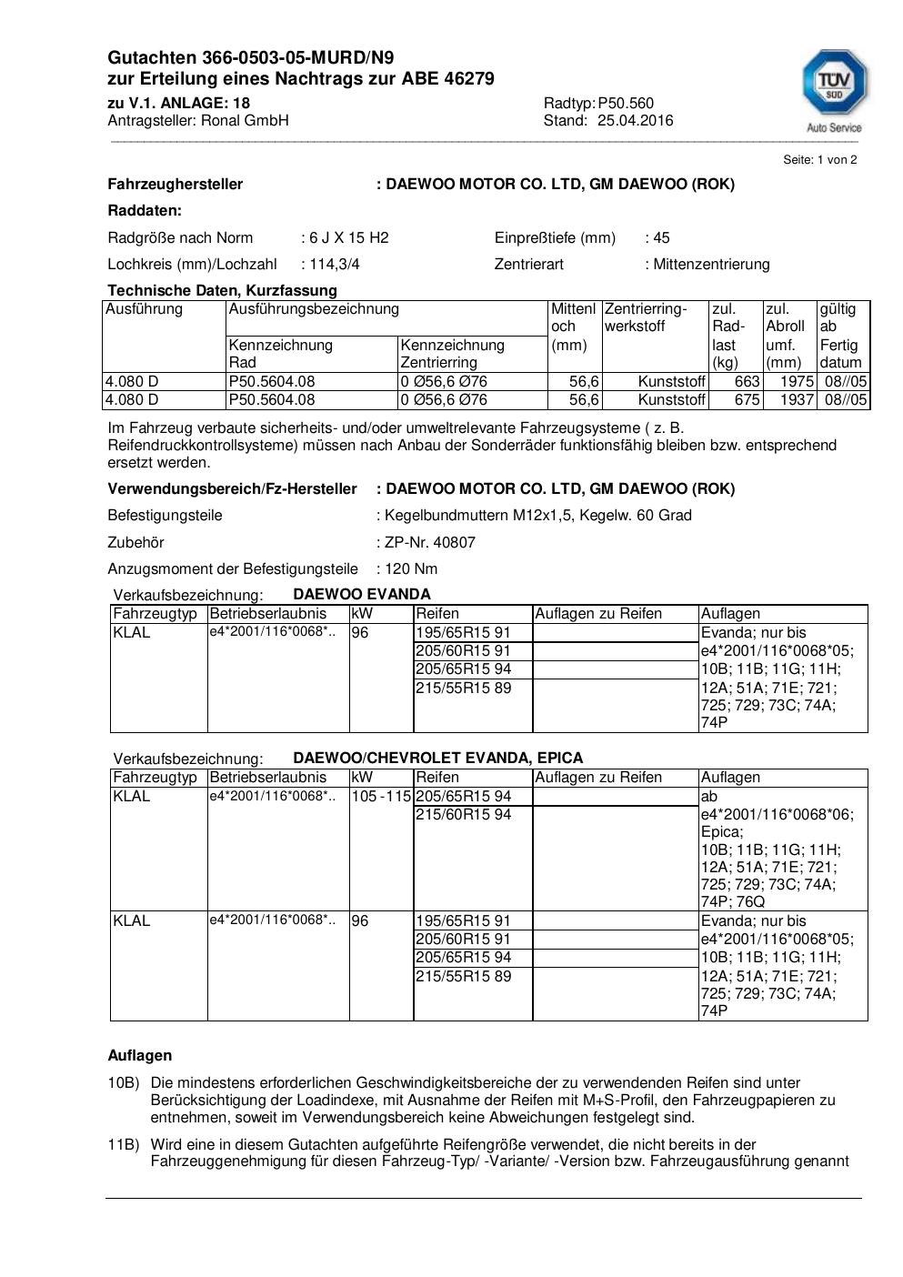 Dieses Gutachten (abe) bezieht sich auf die Alufelge Ronal P50.560 in der Ausführung 6Jx15 ET 0, Mittenloch 0 mm (KBA 46279). Im PDF findest du typischerweise zulässige Reifengrößen, Auflagen/Anbauhinweise und – je nach Dokument – Hinweise zur Eintragung.