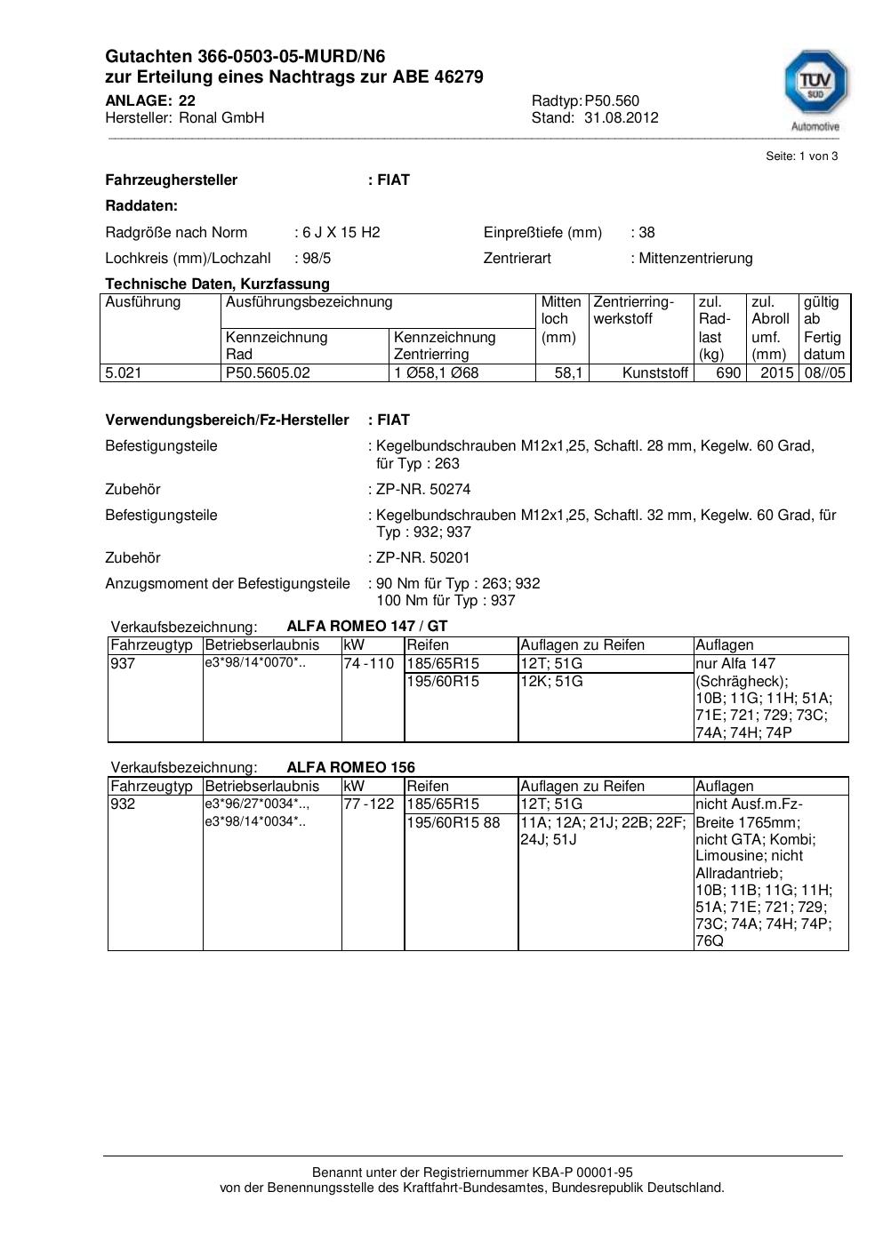 Dieses Gutachten (abe) bezieht sich auf die Alufelge Ronal P50.560 in der Ausführung 6Jx15 ET 0, Mittenloch 0 mm (KBA 46279). Im PDF findest du typischerweise zulässige Reifengrößen, Auflagen/Anbauhinweise und – je nach Dokument – Hinweise zur Eintragung.