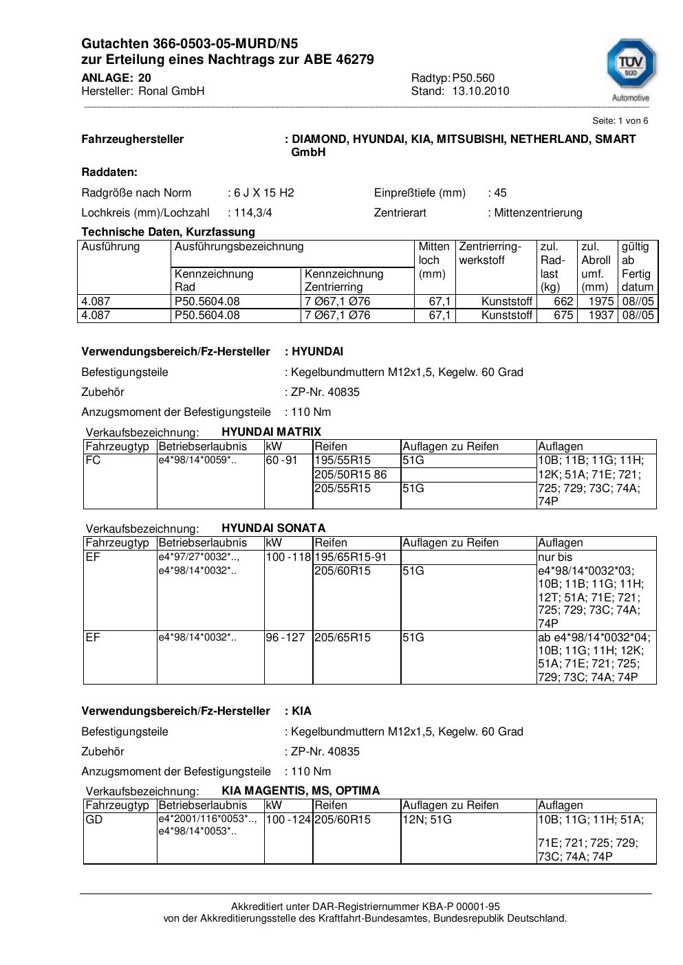 Dieses Gutachten (abe) bezieht sich auf die Alufelge Ronal P50.560 in der Ausführung 6Jx15 ET 0, Mittenloch 0 mm (KBA 46279). Im PDF findest du typischerweise zulässige Reifengrößen, Auflagen/Anbauhinweise und – je nach Dokument – Hinweise zur Eintragung.