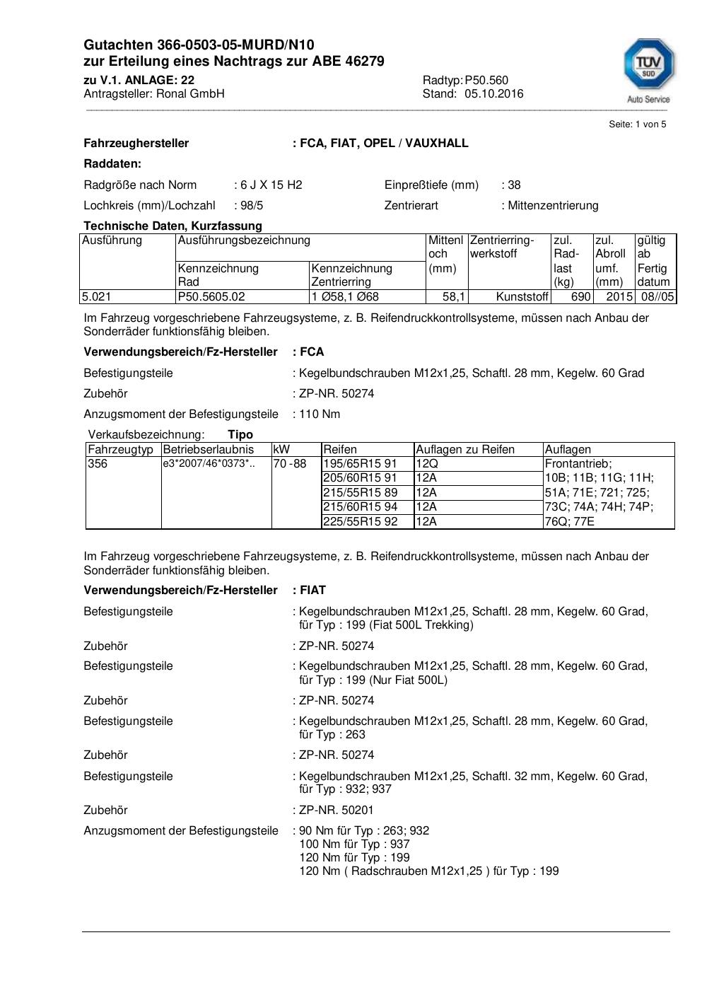 Dieses Gutachten (abe) bezieht sich auf die Alufelge Ronal P50.560 in der Ausführung 6Jx15 ET 0, Mittenloch 0 mm (KBA 46279). Im PDF findest du typischerweise zulässige Reifengrößen, Auflagen/Anbauhinweise und – je nach Dokument – Hinweise zur Eintragung.