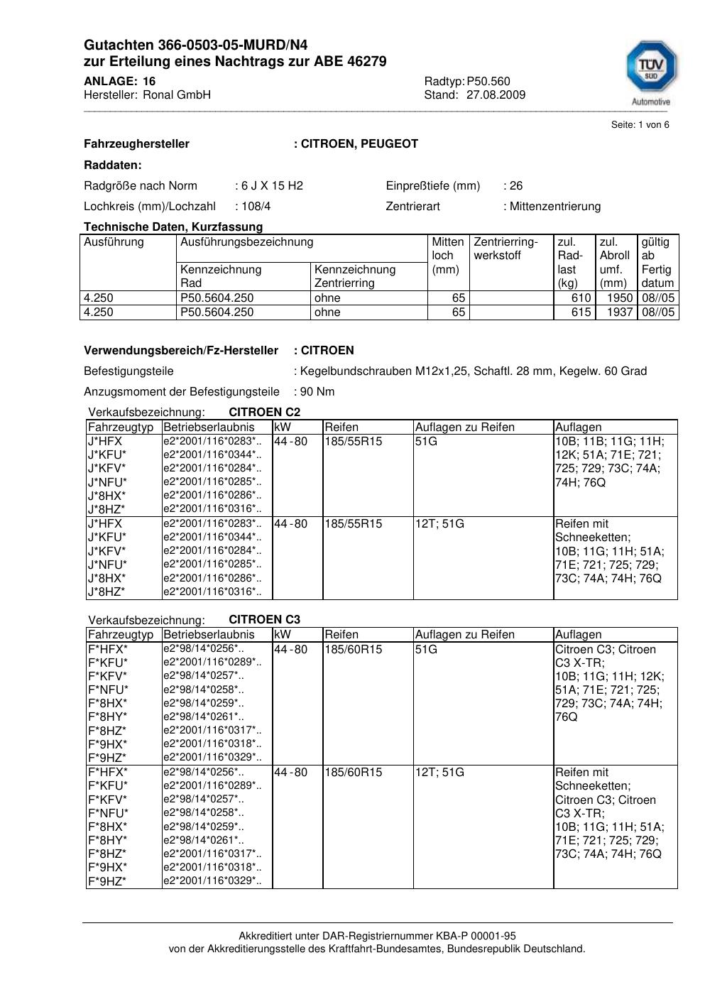 Dieses Gutachten (abe) bezieht sich auf die Alufelge Ronal P50.560 in der Ausführung 6Jx15 ET 0, Mittenloch 0 mm (KBA 46279). Im PDF findest du typischerweise zulässige Reifengrößen, Auflagen/Anbauhinweise und – je nach Dokument – Hinweise zur Eintragung.