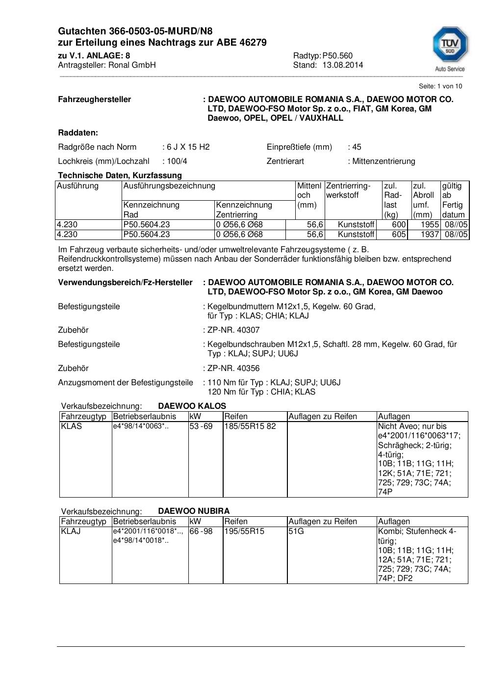 Dieses Gutachten (abe) bezieht sich auf die Alufelge Ronal P50.560 in der Ausführung 6Jx15 ET 0, Mittenloch 0 mm (KBA 46279). Im PDF findest du typischerweise zulässige Reifengrößen, Auflagen/Anbauhinweise und – je nach Dokument – Hinweise zur Eintragung.