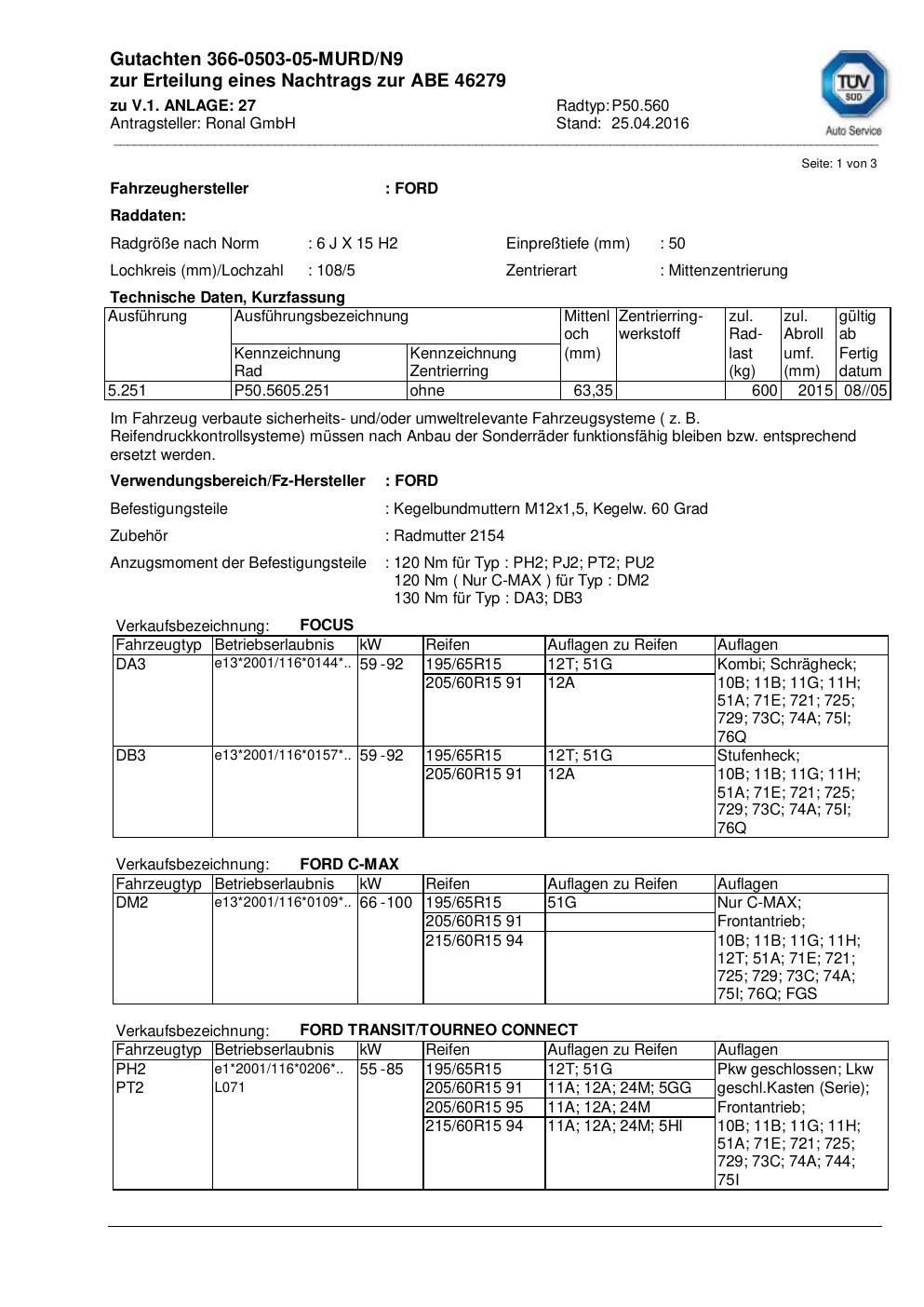 Dieses Gutachten (abe) bezieht sich auf die Alufelge Ronal P50.560 in der Ausführung 6Jx15 ET 0, Mittenloch 0 mm (KBA 46279). Im PDF findest du typischerweise zulässige Reifengrößen, Auflagen/Anbauhinweise und – je nach Dokument – Hinweise zur Eintragung.