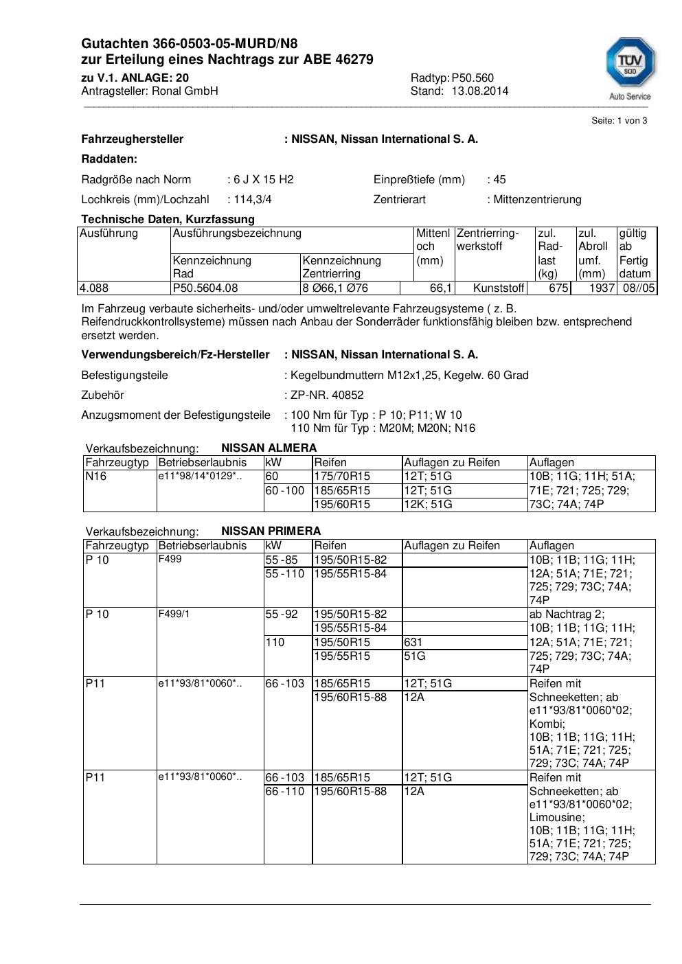 Dieses Gutachten (abe) bezieht sich auf die Alufelge Ronal P50.560 in der Ausführung 6Jx15 ET 0, Mittenloch 0 mm (KBA 46279). Im PDF findest du typischerweise zulässige Reifengrößen, Auflagen/Anbauhinweise und – je nach Dokument – Hinweise zur Eintragung.