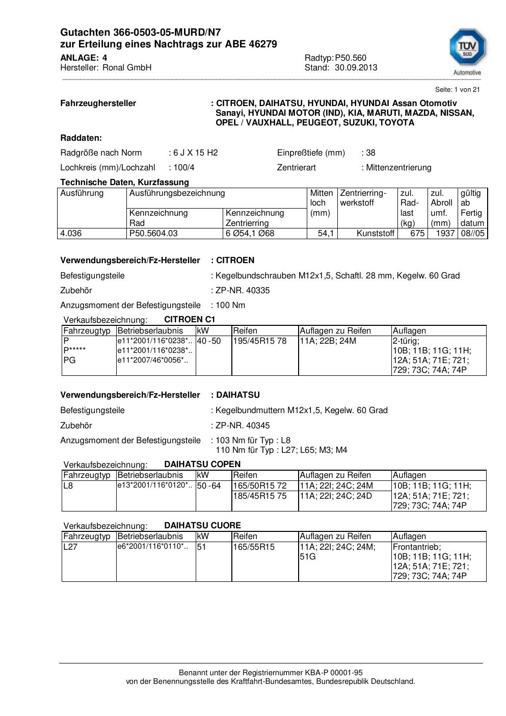 Dieses Gutachten (abe) bezieht sich auf die Alufelge Ronal P50.560 in der Ausführung 6Jx15 ET 0, Mittenloch 0 mm (KBA 46279). Im PDF findest du typischerweise zulässige Reifengrößen, Auflagen/Anbauhinweise und – je nach Dokument – Hinweise zur Eintragung.