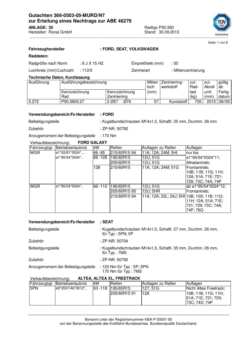 Dieses Gutachten (abe) bezieht sich auf die Alufelge Ronal P50.560 in der Ausführung 6Jx15 ET 0, Mittenloch 0 mm (KBA 46279). Im PDF findest du typischerweise zulässige Reifengrößen, Auflagen/Anbauhinweise und – je nach Dokument – Hinweise zur Eintragung.