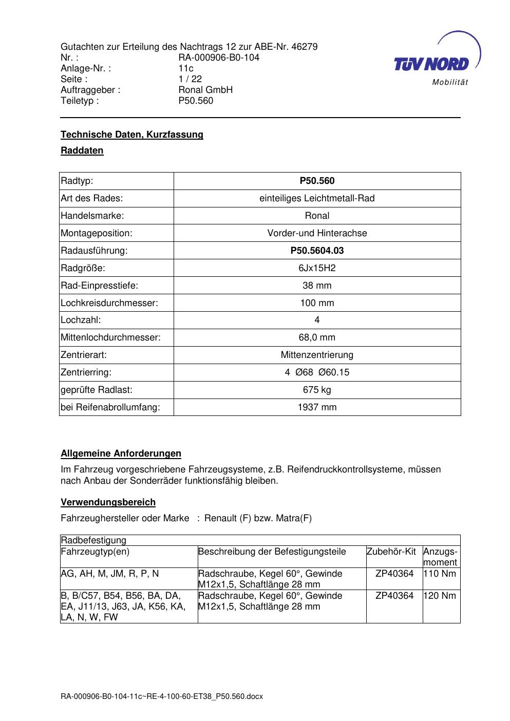 Dieses Gutachten (abe) bezieht sich auf die Alufelge Ronal P50.560 in der Ausführung 6Jx15 ET 0, Mittenloch 0 mm (KBA 46279). Im PDF findest du typischerweise zulässige Reifengrößen, Auflagen/Anbauhinweise und – je nach Dokument – Hinweise zur Eintragung.