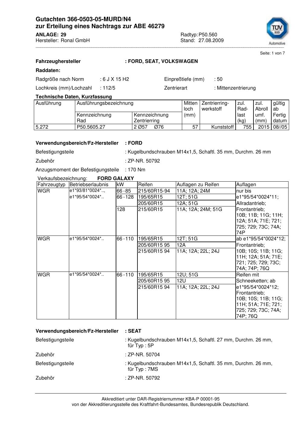 Felgengutachten / abe für Alufelgen Ronal P50.560 (6Jx15 ET 0, Mittenloch 0 mm) mit KBA 46279 (Zertifikatsnummer 46279). Hier kostenlos als PDF herunterladen. Der Download-Link ist 24 Stunden gültig und kann bis zu zwei Mal verwendet werden.