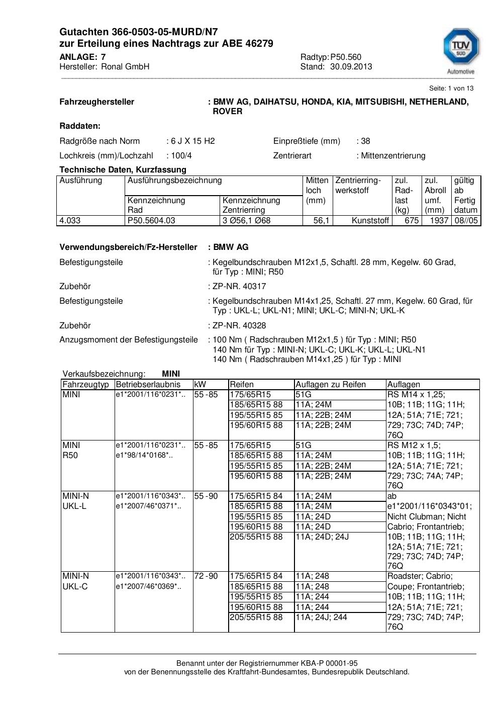 Dieses Gutachten (abe) bezieht sich auf die Alufelge Ronal P50.560 in der Ausführung 6Jx15 ET 0, Mittenloch 0 mm (KBA 46279). Im PDF findest du typischerweise zulässige Reifengrößen, Auflagen/Anbauhinweise und – je nach Dokument – Hinweise zur Eintragung.