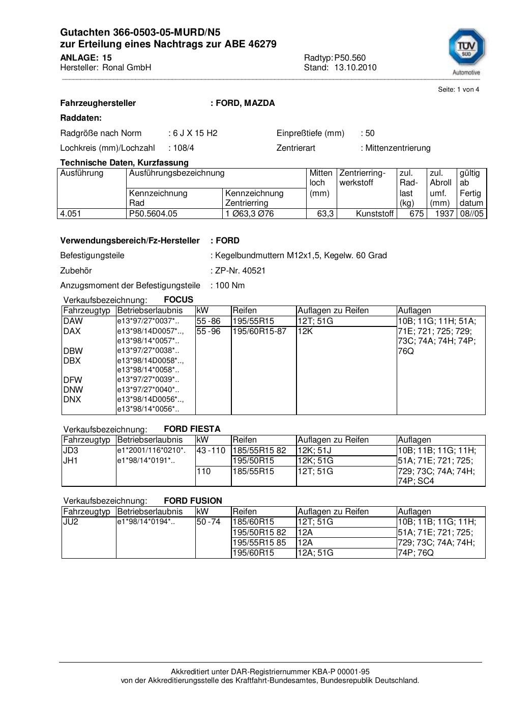Dieses Gutachten (abe) bezieht sich auf die Alufelge Ronal P50.560 in der Ausführung 6Jx15 ET 0, Mittenloch 0 mm (KBA 46279). Im PDF findest du typischerweise zulässige Reifengrößen, Auflagen/Anbauhinweise und – je nach Dokument – Hinweise zur Eintragung.