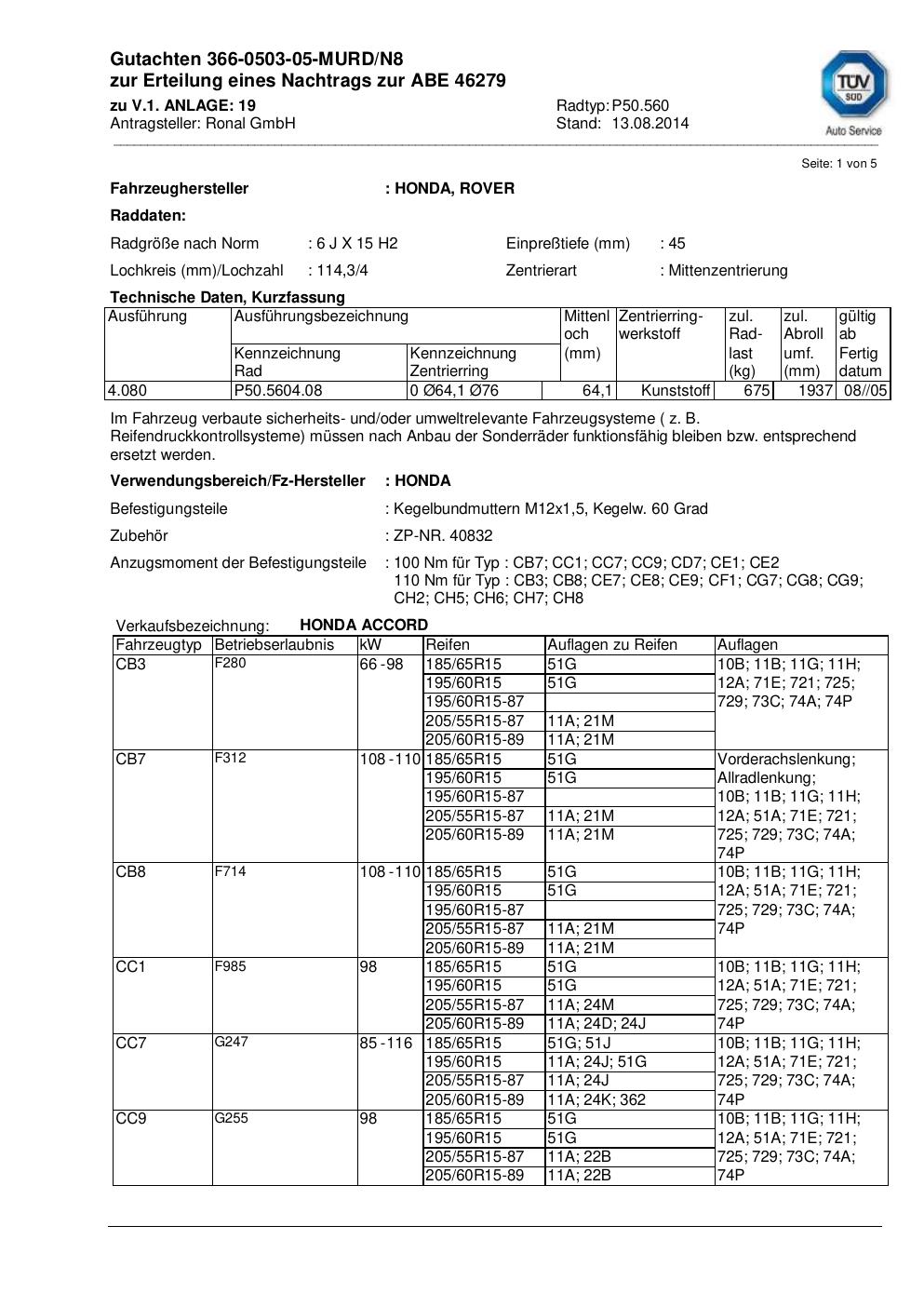 Dieses Gutachten (abe) bezieht sich auf die Alufelge Ronal P50.560 in der Ausführung 6Jx15 ET 0, Mittenloch 0 mm (KBA 46279). Im PDF findest du typischerweise zulässige Reifengrößen, Auflagen/Anbauhinweise und – je nach Dokument – Hinweise zur Eintragung.
