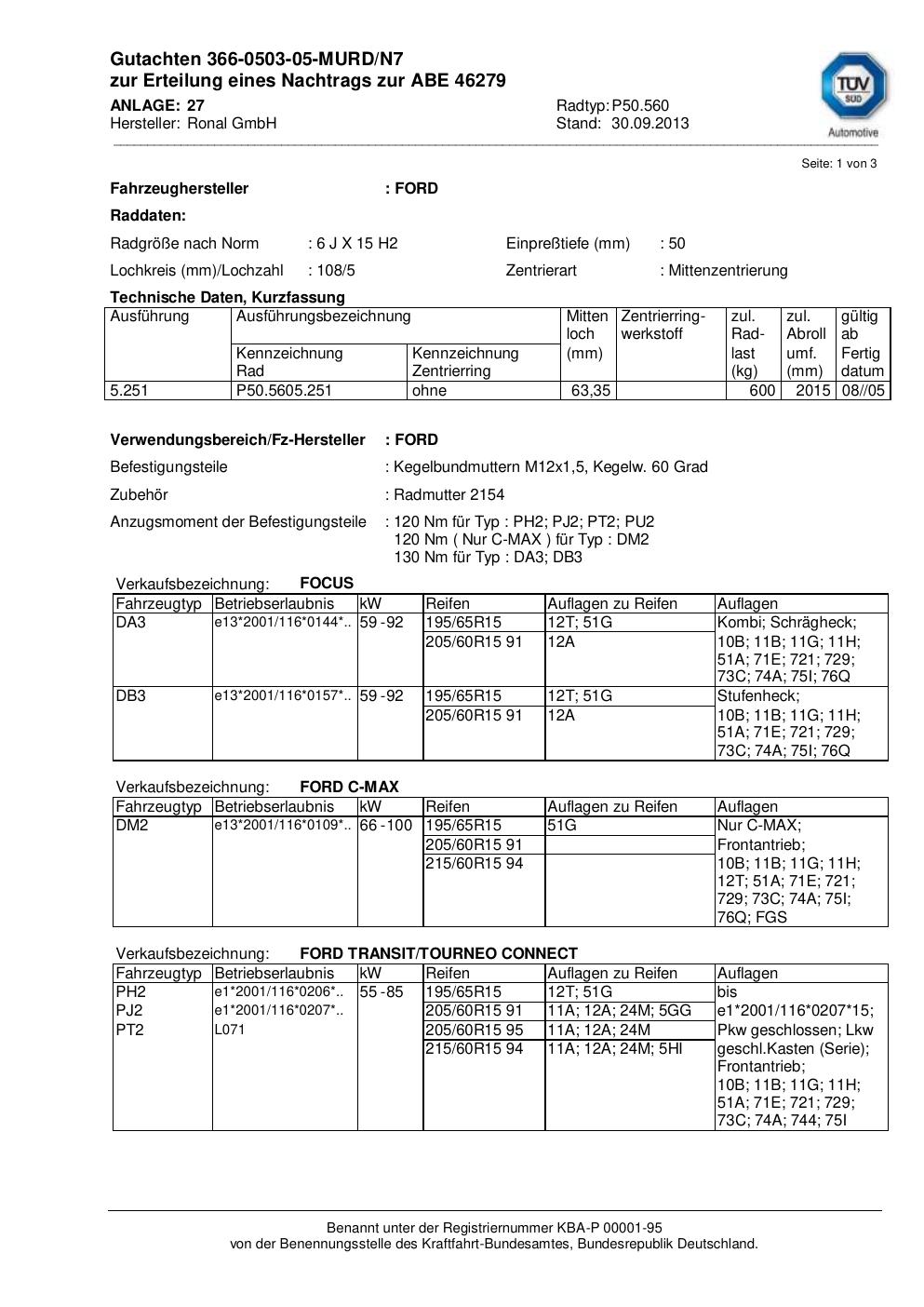 Dieses Gutachten (abe) bezieht sich auf die Alufelge Ronal P50.560 in der Ausführung 6Jx15 ET 0, Mittenloch 0 mm (KBA 46279). Im PDF findest du typischerweise zulässige Reifengrößen, Auflagen/Anbauhinweise und – je nach Dokument – Hinweise zur Eintragung.