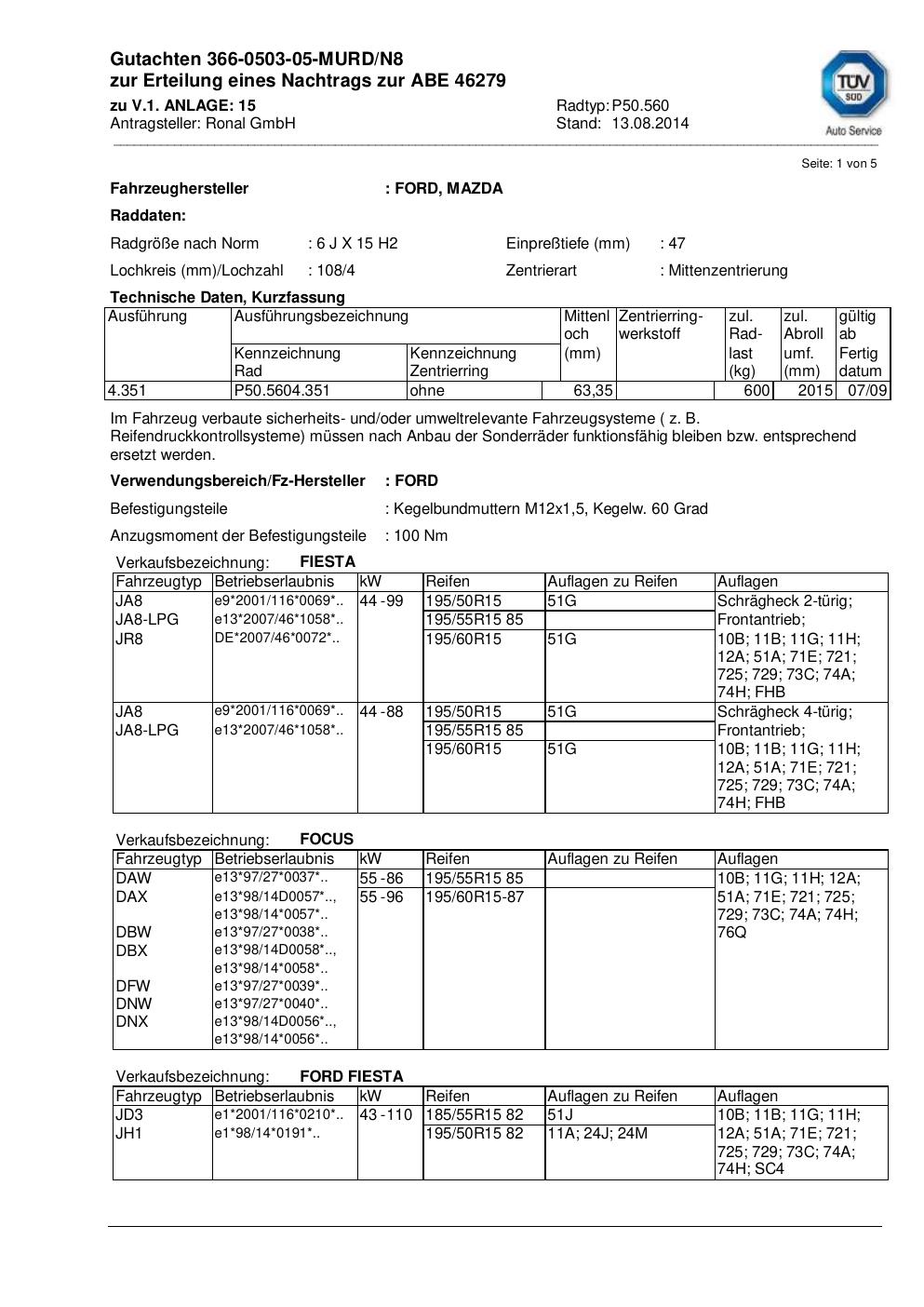 Dieses Gutachten (abe) bezieht sich auf die Alufelge Ronal P50.560 in der Ausführung 6Jx15 ET 0, Mittenloch 0 mm (KBA 46279). Im PDF findest du typischerweise zulässige Reifengrößen, Auflagen/Anbauhinweise und – je nach Dokument – Hinweise zur Eintragung.