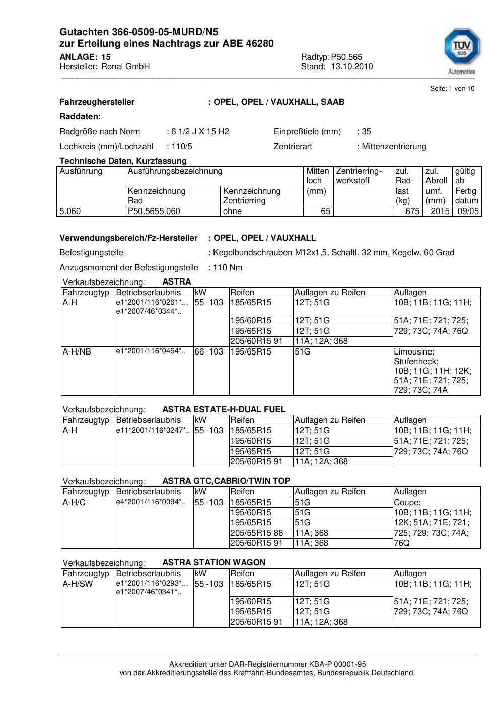Dieses Gutachten (abe) bezieht sich auf die Alufelge Ronal P50.565 in der Ausführung 2Jx15 ET 0, Mittenloch 0 mm (KBA 46280). Im PDF findest du typischerweise zulässige Reifengrößen, Auflagen/Anbauhinweise und – je nach Dokument – Hinweise zur Eintragung.