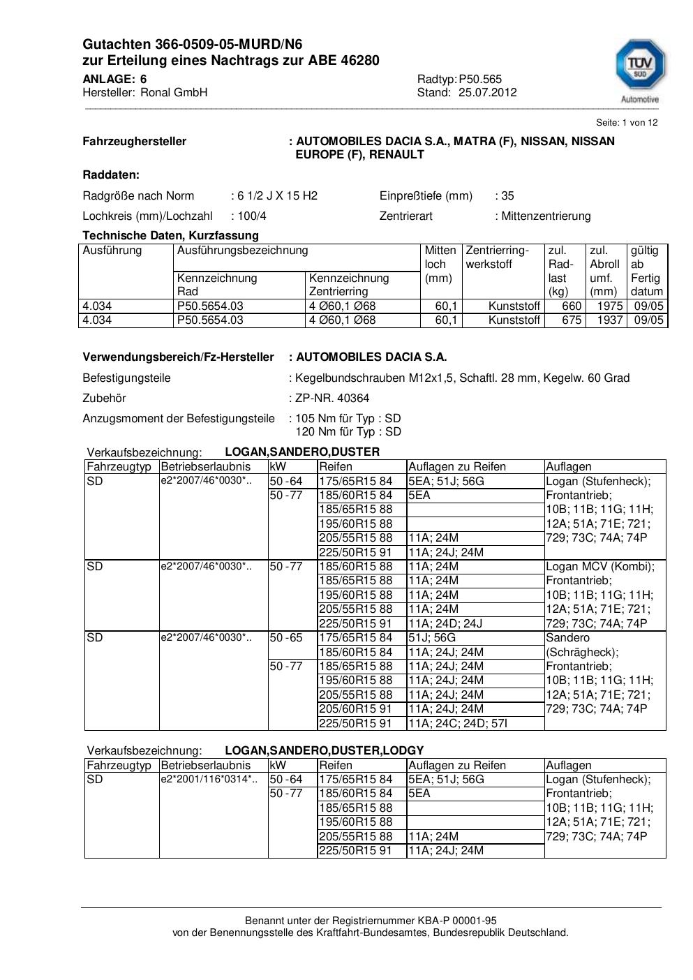 Dieses Gutachten (abe) bezieht sich auf die Alufelge Ronal P50.565 in der Ausführung 2Jx15 ET 0, Mittenloch 0 mm (KBA 46280). Im PDF findest du typischerweise zulässige Reifengrößen, Auflagen/Anbauhinweise und – je nach Dokument – Hinweise zur Eintragung.