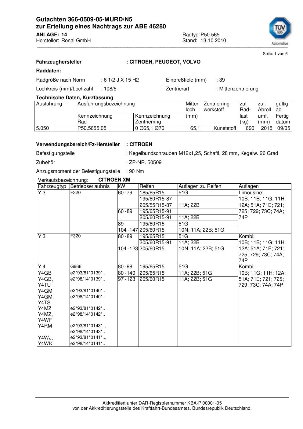 Felgengutachten / abe für Alufelgen Ronal P50.565 (2Jx15 ET 0, Mittenloch 0 mm) mit KBA 46280 (Zertifikatsnummer 46280). Hier kostenlos als PDF herunterladen. Der Download-Link ist 24 Stunden gültig und kann bis zu zwei Mal verwendet werden.