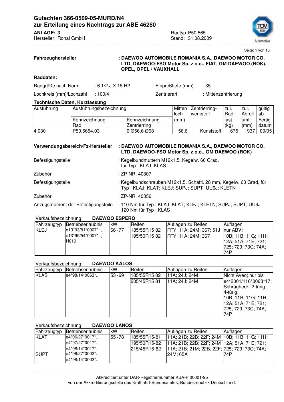 Dieses Gutachten (abe) bezieht sich auf die Alufelge Ronal P50.565 in der Ausführung 2Jx15 ET 0, Mittenloch 0 mm (KBA 46280). Im PDF findest du typischerweise zulässige Reifengrößen, Auflagen/Anbauhinweise und – je nach Dokument – Hinweise zur Eintragung.