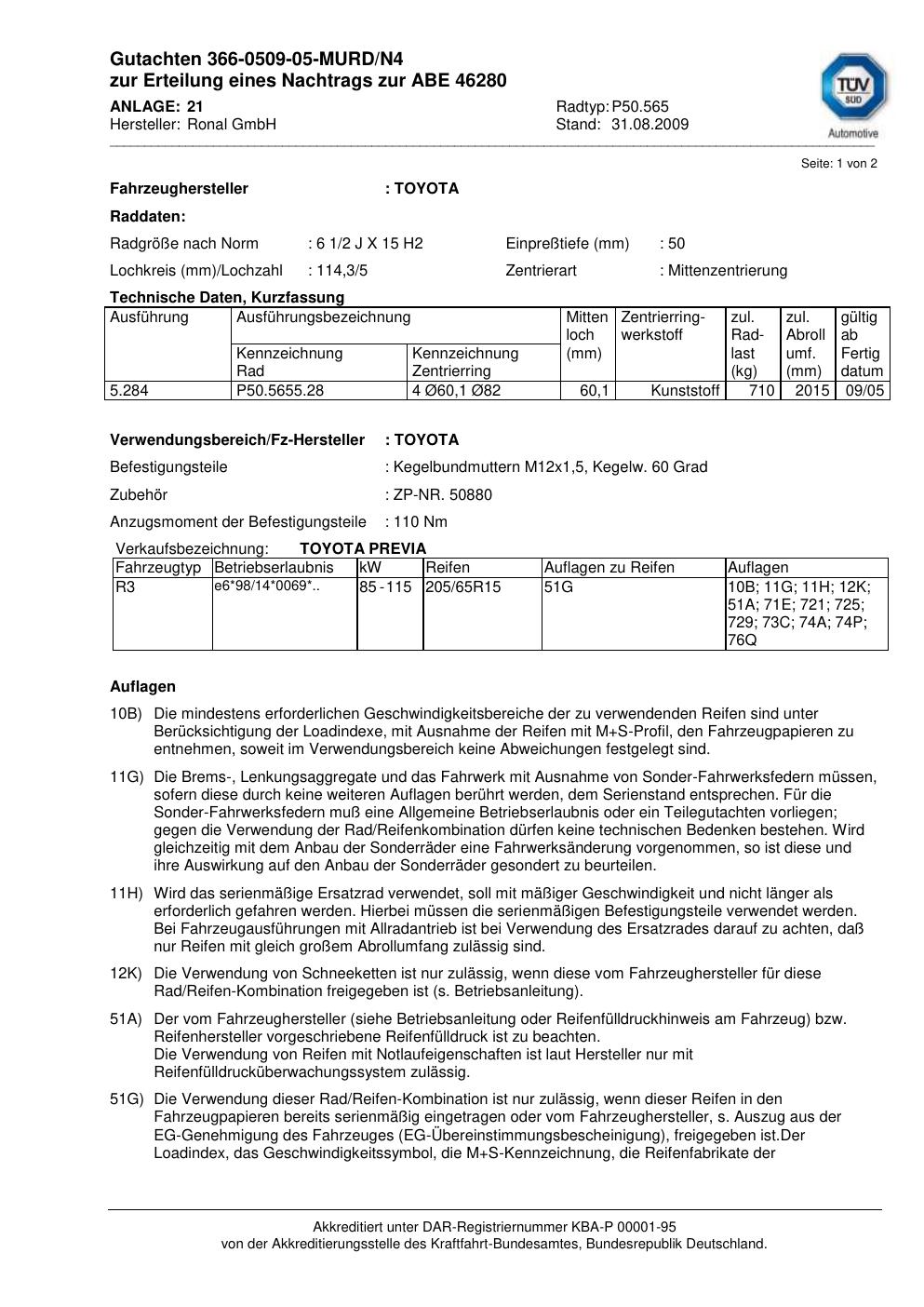 Dieses Gutachten (abe) bezieht sich auf die Alufelge Ronal P50.565 in der Ausführung 2Jx15 ET 0, Mittenloch 0 mm (KBA 46280). Im PDF findest du typischerweise zulässige Reifengrößen, Auflagen/Anbauhinweise und – je nach Dokument – Hinweise zur Eintragung.