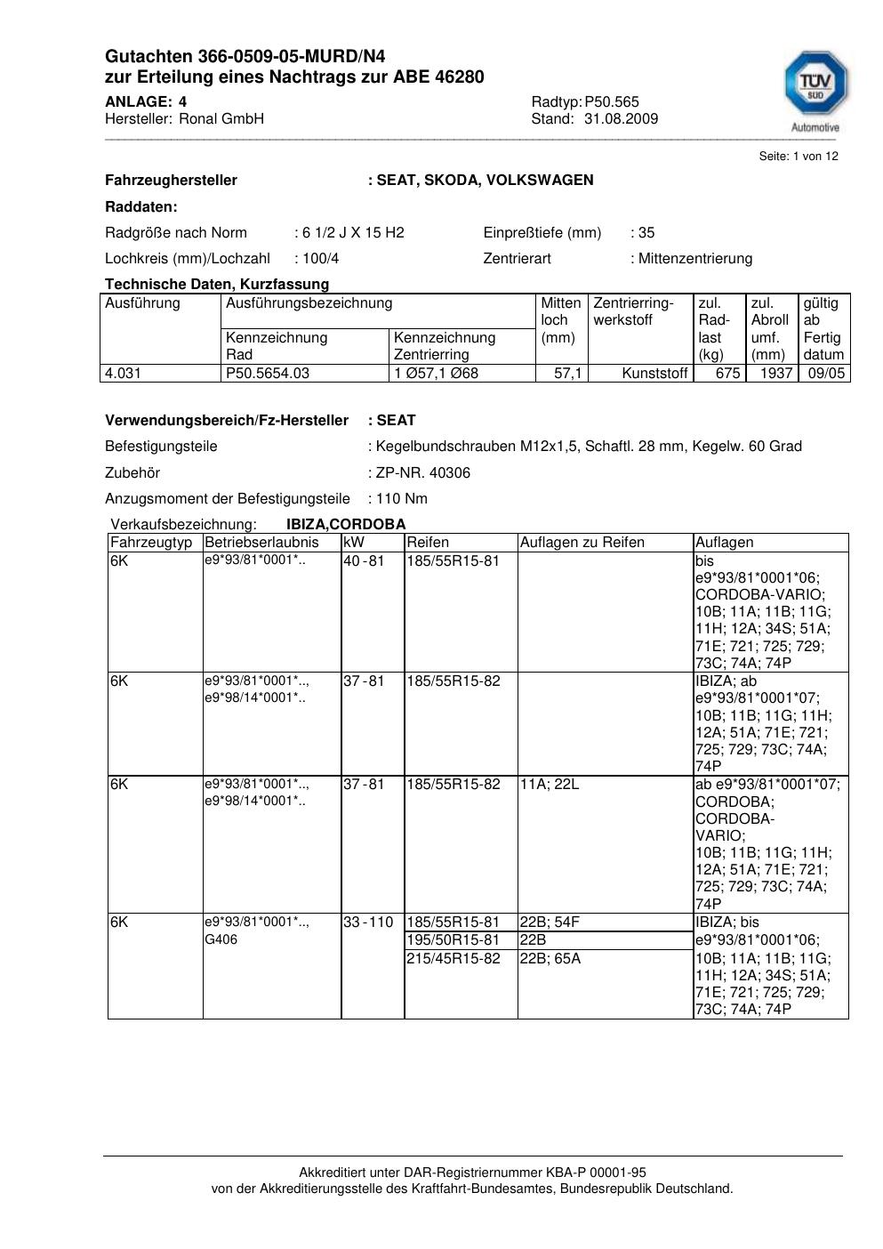 Dieses Gutachten (abe) bezieht sich auf die Alufelge Ronal P50.565 in der Ausführung 2Jx15 ET 0, Mittenloch 0 mm (KBA 46280). Im PDF findest du typischerweise zulässige Reifengrößen, Auflagen/Anbauhinweise und – je nach Dokument – Hinweise zur Eintragung.