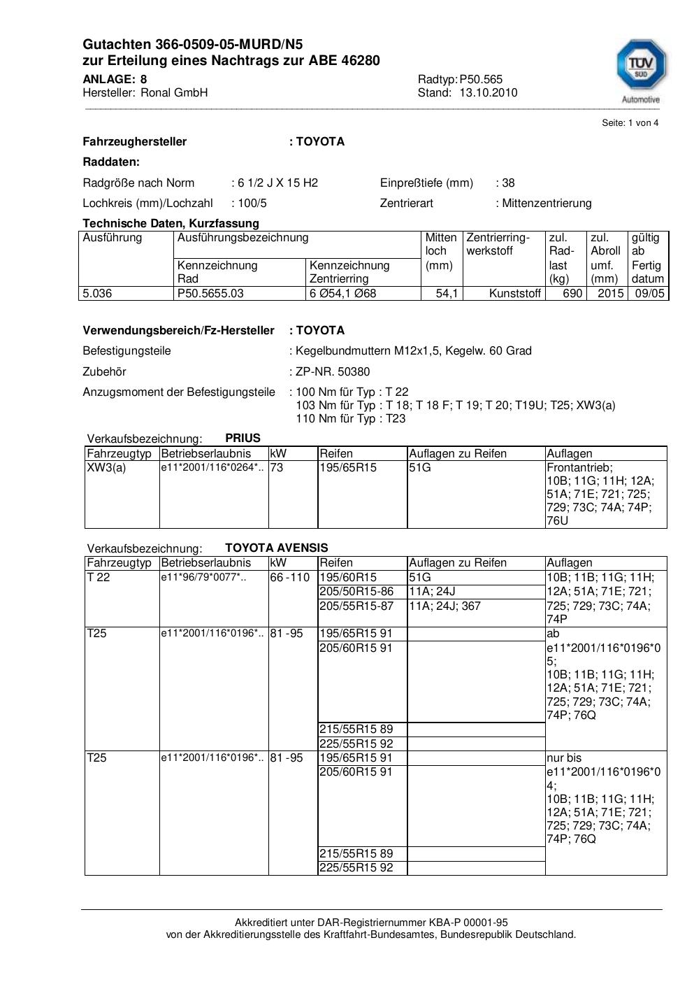Dieses Gutachten (abe) bezieht sich auf die Alufelge Ronal P50.565 in der Ausführung 2Jx15 ET 0, Mittenloch 0 mm (KBA 46280). Im PDF findest du typischerweise zulässige Reifengrößen, Auflagen/Anbauhinweise und – je nach Dokument – Hinweise zur Eintragung.