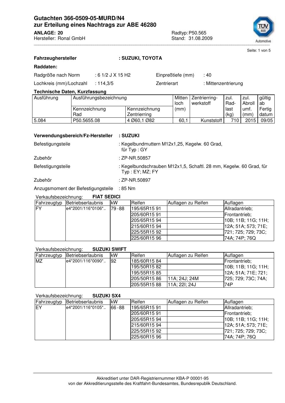 Dieses Gutachten (abe) bezieht sich auf die Alufelge Ronal P50.565 in der Ausführung 2Jx15 ET 0, Mittenloch 0 mm (KBA 46280). Im PDF findest du typischerweise zulässige Reifengrößen, Auflagen/Anbauhinweise und – je nach Dokument – Hinweise zur Eintragung.