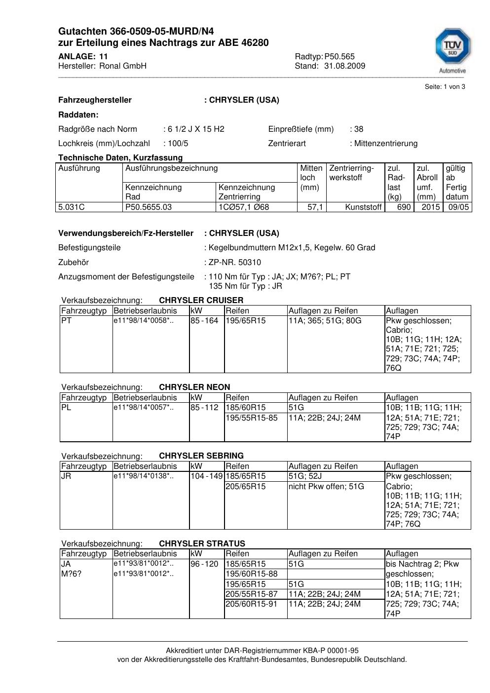 Dieses Gutachten (abe) bezieht sich auf die Alufelge Ronal P50.565 in der Ausführung 2Jx15 ET 0, Mittenloch 0 mm (KBA 46280). Im PDF findest du typischerweise zulässige Reifengrößen, Auflagen/Anbauhinweise und – je nach Dokument – Hinweise zur Eintragung.