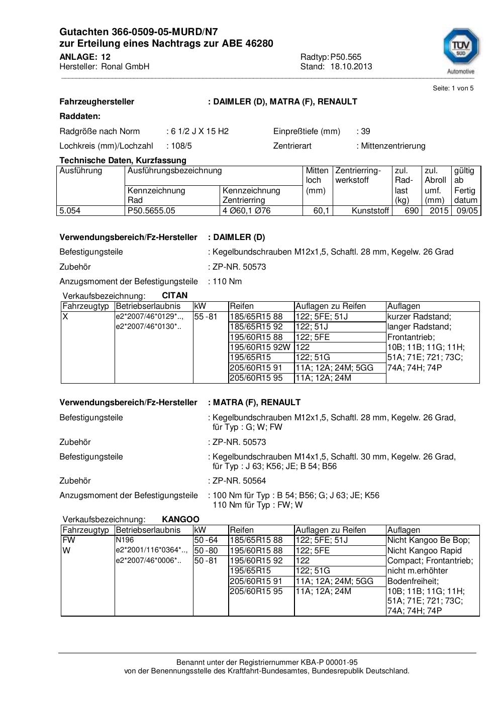 Dieses Gutachten (abe) bezieht sich auf die Alufelge Ronal P50.565 in der Ausführung 2Jx15 ET 0, Mittenloch 0 mm (KBA 46280). Im PDF findest du typischerweise zulässige Reifengrößen, Auflagen/Anbauhinweise und – je nach Dokument – Hinweise zur Eintragung.