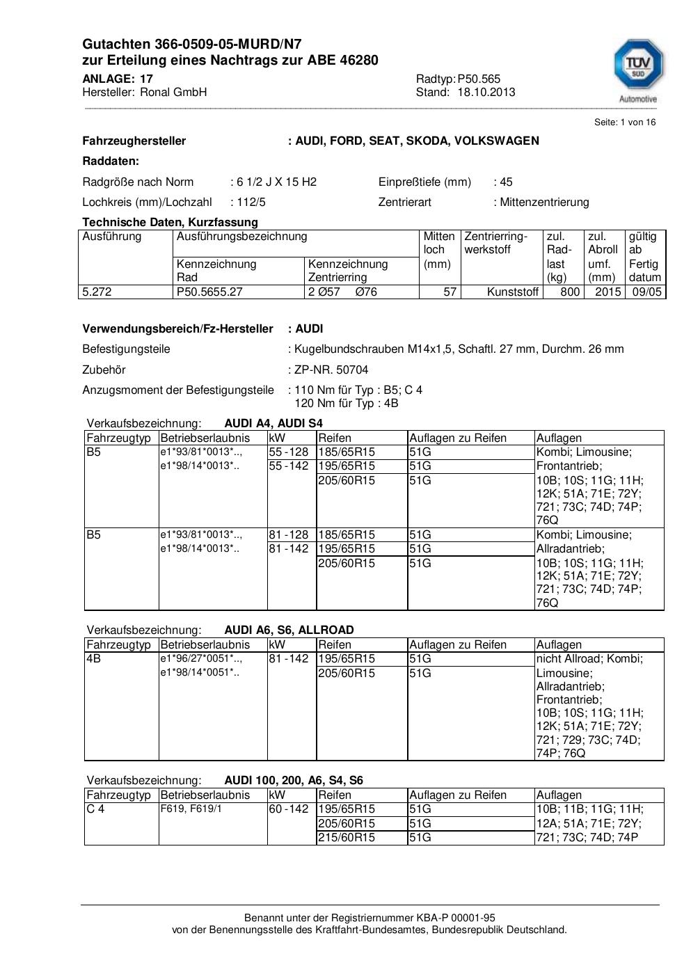 Felgengutachten / abe für Alufelgen Ronal P50.565 (2Jx15 ET 0, Mittenloch 0 mm) mit KBA 46280 (Zertifikatsnummer 46280). Hier kostenlos als PDF herunterladen. Der Download-Link ist 24 Stunden gültig und kann bis zu zwei Mal verwendet werden.