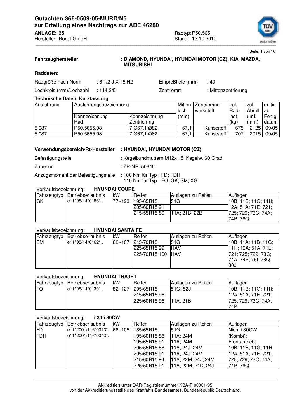 Felgengutachten / abe für Alufelgen Ronal P50.565 (2Jx15 ET 0, Mittenloch 0 mm) mit KBA 46280 (Zertifikatsnummer 46280). Hier kostenlos als PDF herunterladen. Der Download-Link ist 24 Stunden gültig und kann bis zu zwei Mal verwendet werden.