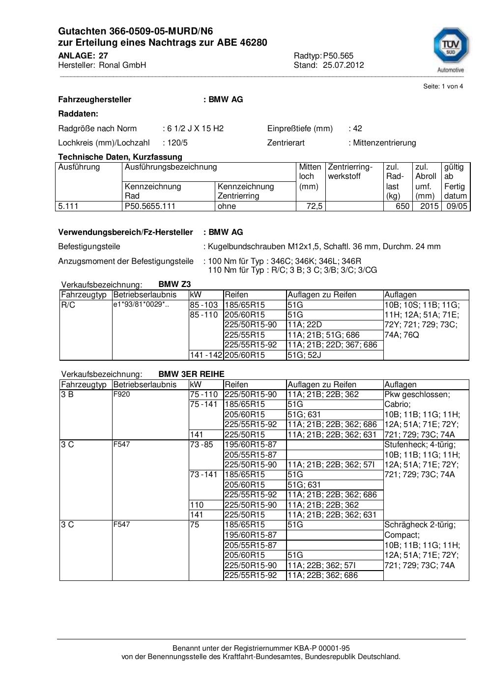 Dieses Gutachten (abe) bezieht sich auf die Alufelge Ronal P50.565 in der Ausführung 2Jx15 ET 0, Mittenloch 0 mm (KBA 46280). Im PDF findest du typischerweise zulässige Reifengrößen, Auflagen/Anbauhinweise und – je nach Dokument – Hinweise zur Eintragung.