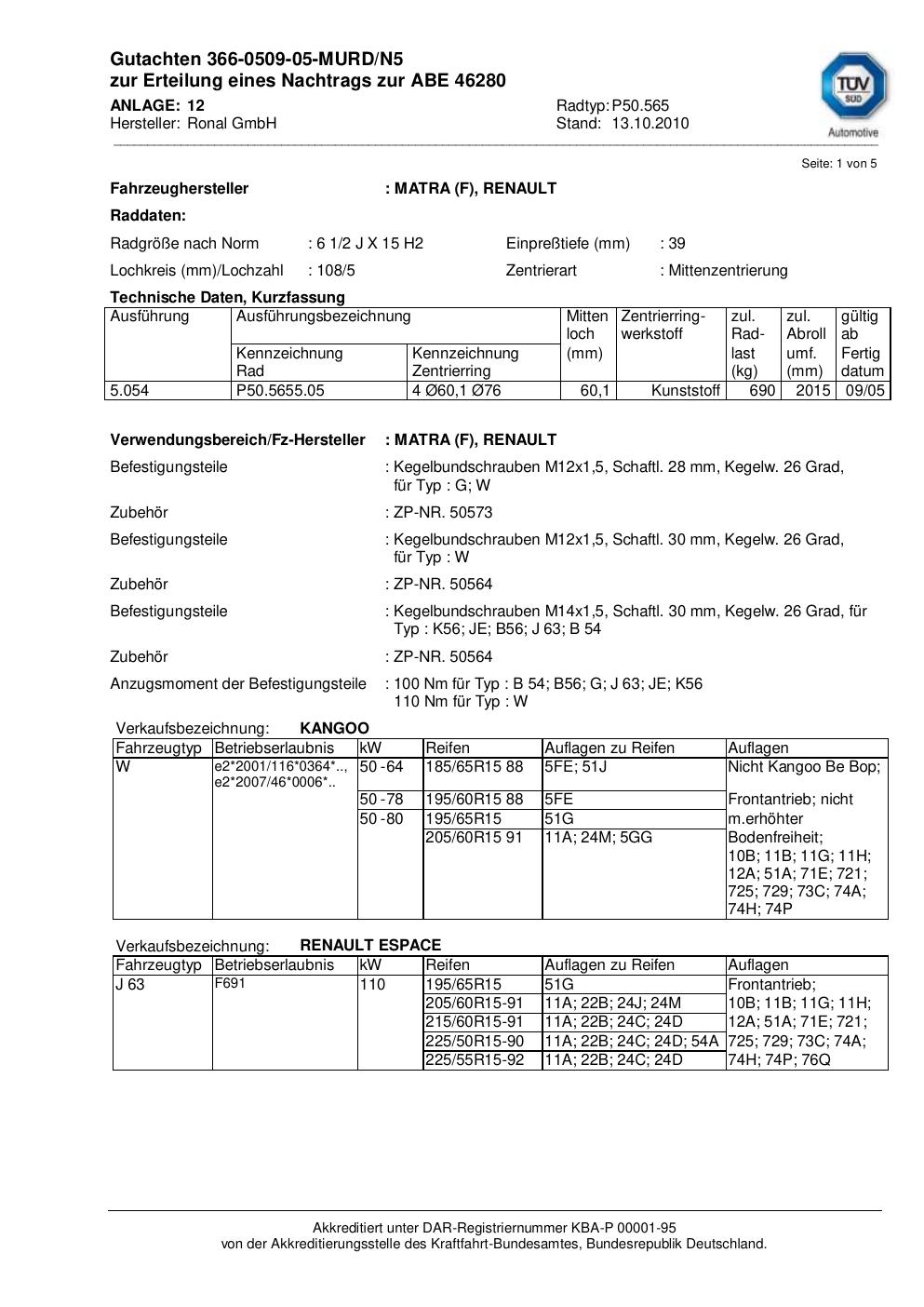 Felgengutachten / abe für Alufelgen Ronal P50.565 (2Jx15 ET 0, Mittenloch 0 mm) mit KBA 46280 (Zertifikatsnummer 46280). Hier kostenlos als PDF herunterladen. Der Download-Link ist 24 Stunden gültig und kann bis zu zwei Mal verwendet werden.