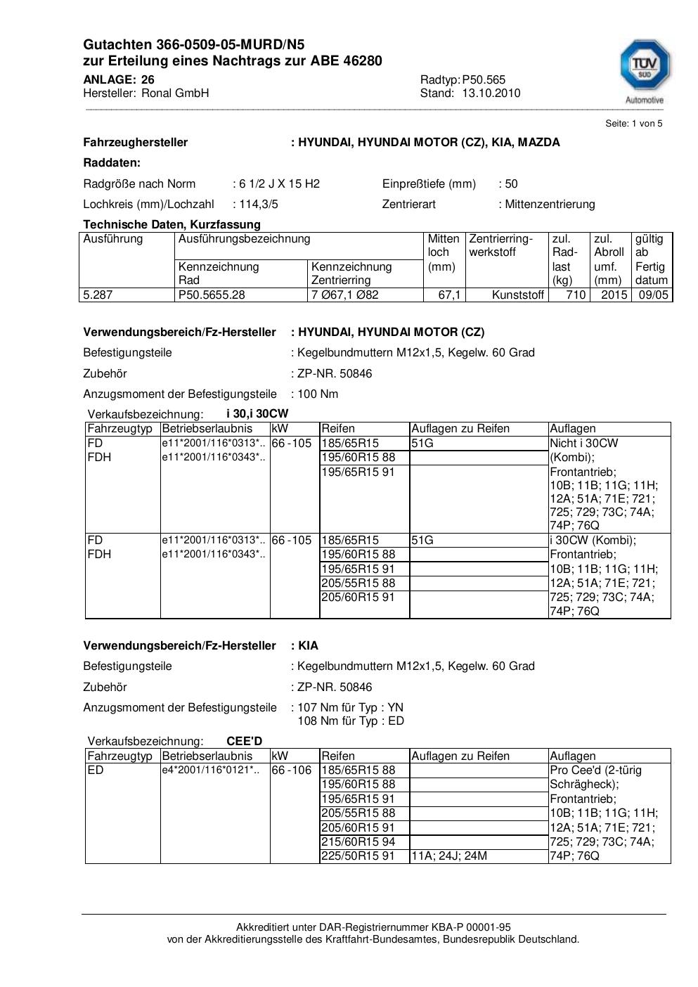 Felgengutachten / abe für Alufelgen Ronal P50.565 (2Jx15 ET 0, Mittenloch 0 mm) mit KBA 46280 (Zertifikatsnummer 46280). Hier kostenlos als PDF herunterladen. Der Download-Link ist 24 Stunden gültig und kann bis zu zwei Mal verwendet werden.
