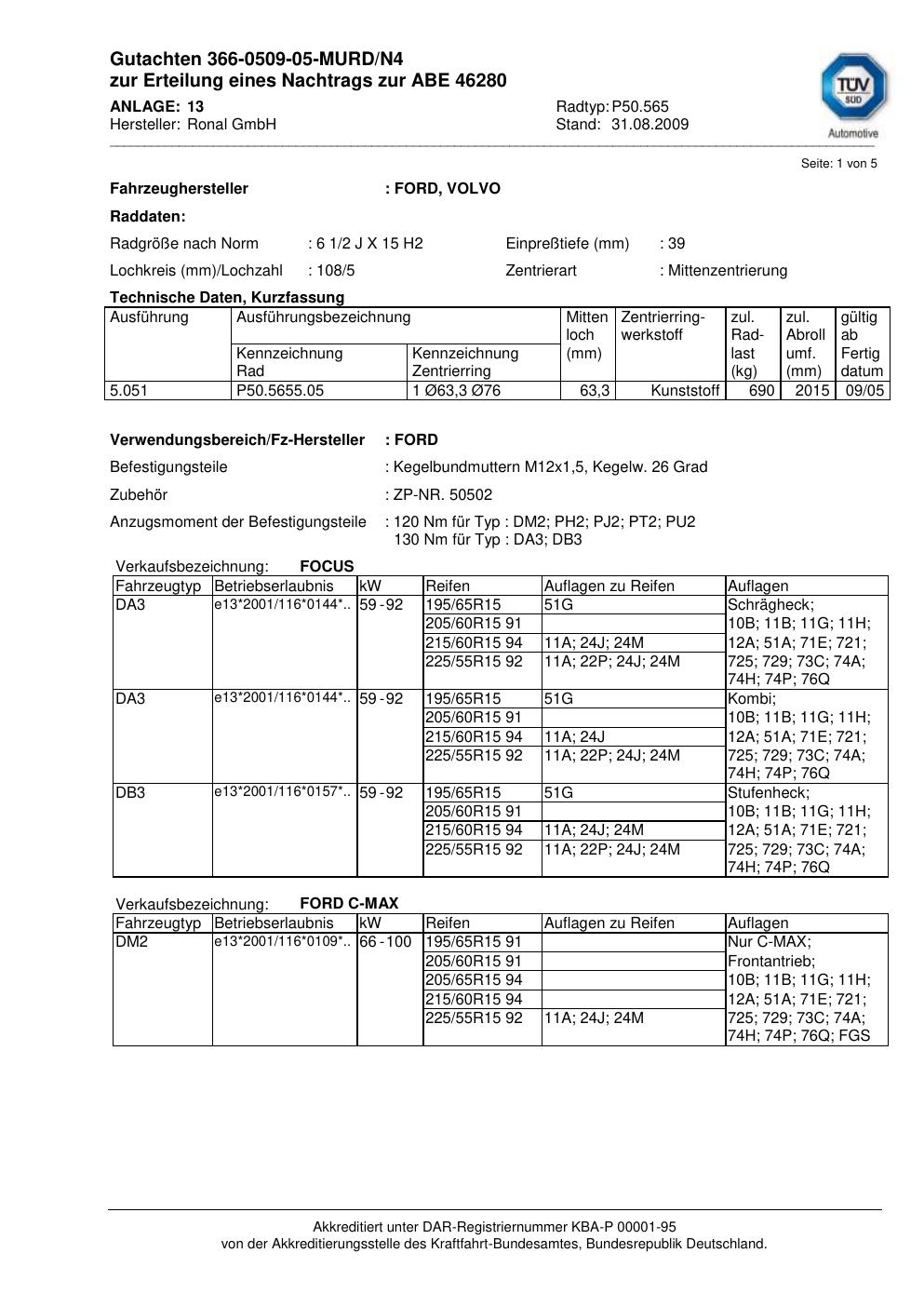 Felgengutachten / abe für Alufelgen Ronal P50.565 (2Jx15 ET 0, Mittenloch 0 mm) mit KBA 46280 (Zertifikatsnummer 46280). Hier kostenlos als PDF herunterladen. Der Download-Link ist 24 Stunden gültig und kann bis zu zwei Mal verwendet werden.