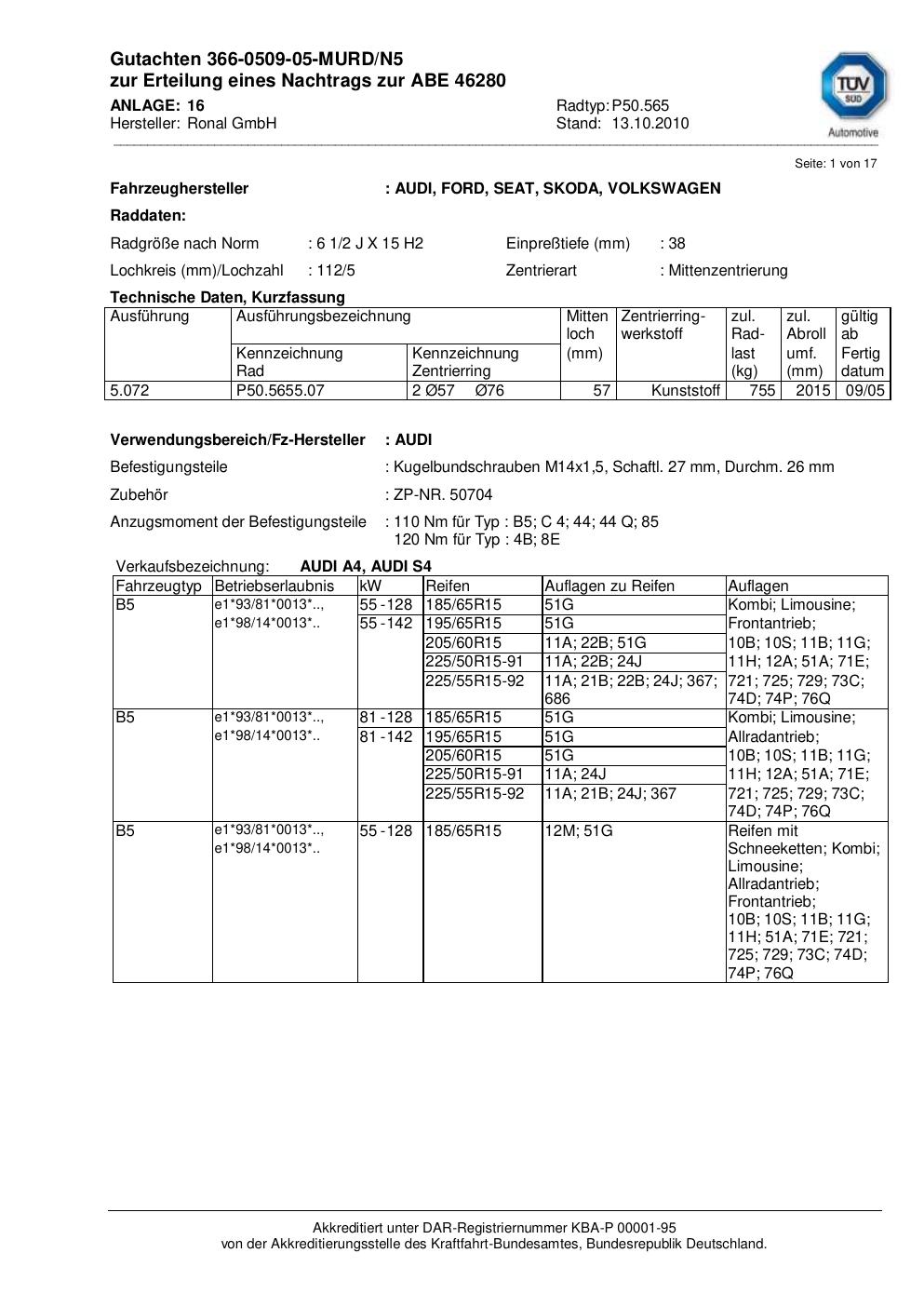 Felgengutachten / abe für Alufelgen Ronal P50.565 (2Jx15 ET 0, Mittenloch 0 mm) mit KBA 46280 (Zertifikatsnummer 46280). Hier kostenlos als PDF herunterladen. Der Download-Link ist 24 Stunden gültig und kann bis zu zwei Mal verwendet werden.