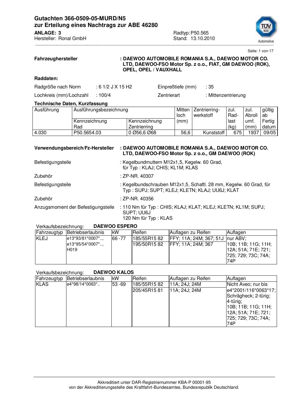 Felgengutachten / abe für Alufelgen Ronal P50.565 (2Jx15 ET 0, Mittenloch 0 mm) mit KBA 46280 (Zertifikatsnummer 46280). Hier kostenlos als PDF herunterladen. Der Download-Link ist 24 Stunden gültig und kann bis zu zwei Mal verwendet werden.