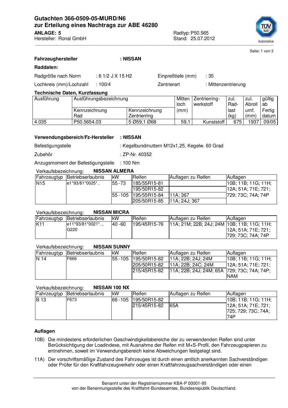 Dieses Gutachten (abe) bezieht sich auf die Alufelge Ronal P50.565 in der Ausführung 2Jx15 ET 0, Mittenloch 0 mm (KBA 46280). Im PDF findest du typischerweise zulässige Reifengrößen, Auflagen/Anbauhinweise und – je nach Dokument – Hinweise zur Eintragung.