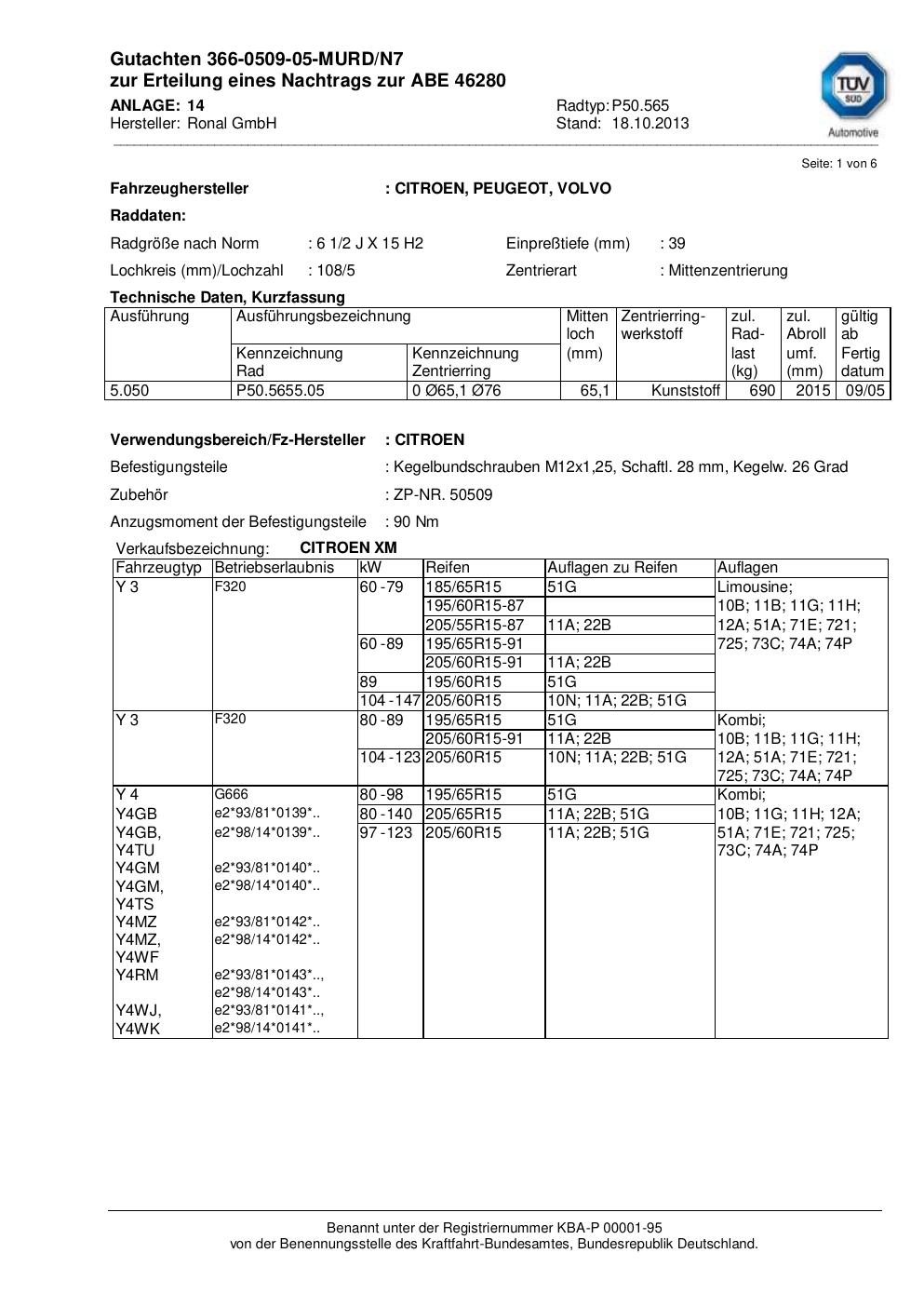 Dieses Gutachten (abe) bezieht sich auf die Alufelge Ronal P50.565 in der Ausführung 2Jx15 ET 0, Mittenloch 0 mm (KBA 46280). Im PDF findest du typischerweise zulässige Reifengrößen, Auflagen/Anbauhinweise und – je nach Dokument – Hinweise zur Eintragung.