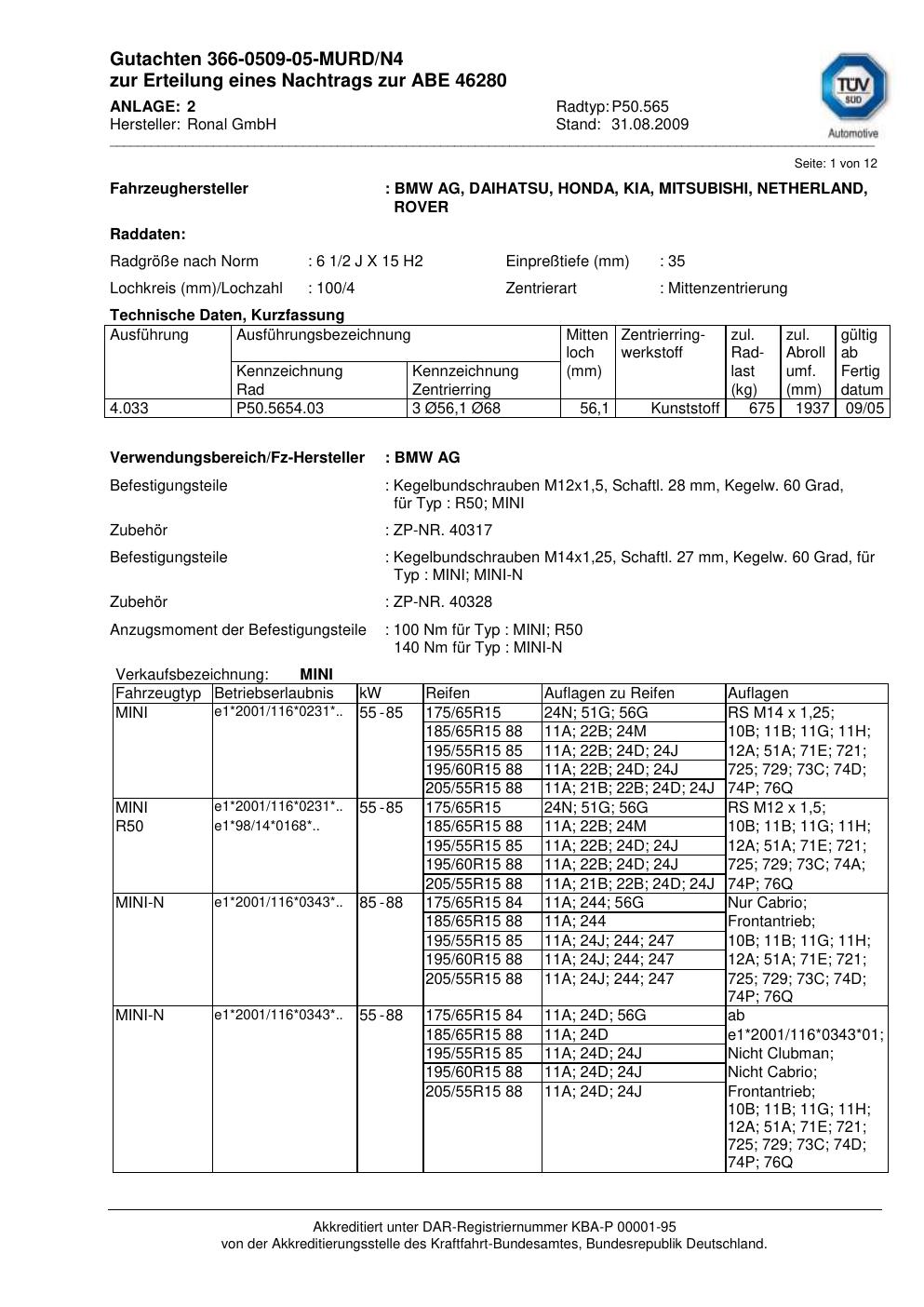 Dieses Gutachten (abe) bezieht sich auf die Alufelge Ronal P50.565 in der Ausführung 2Jx15 ET 0, Mittenloch 0 mm (KBA 46280). Im PDF findest du typischerweise zulässige Reifengrößen, Auflagen/Anbauhinweise und – je nach Dokument – Hinweise zur Eintragung.