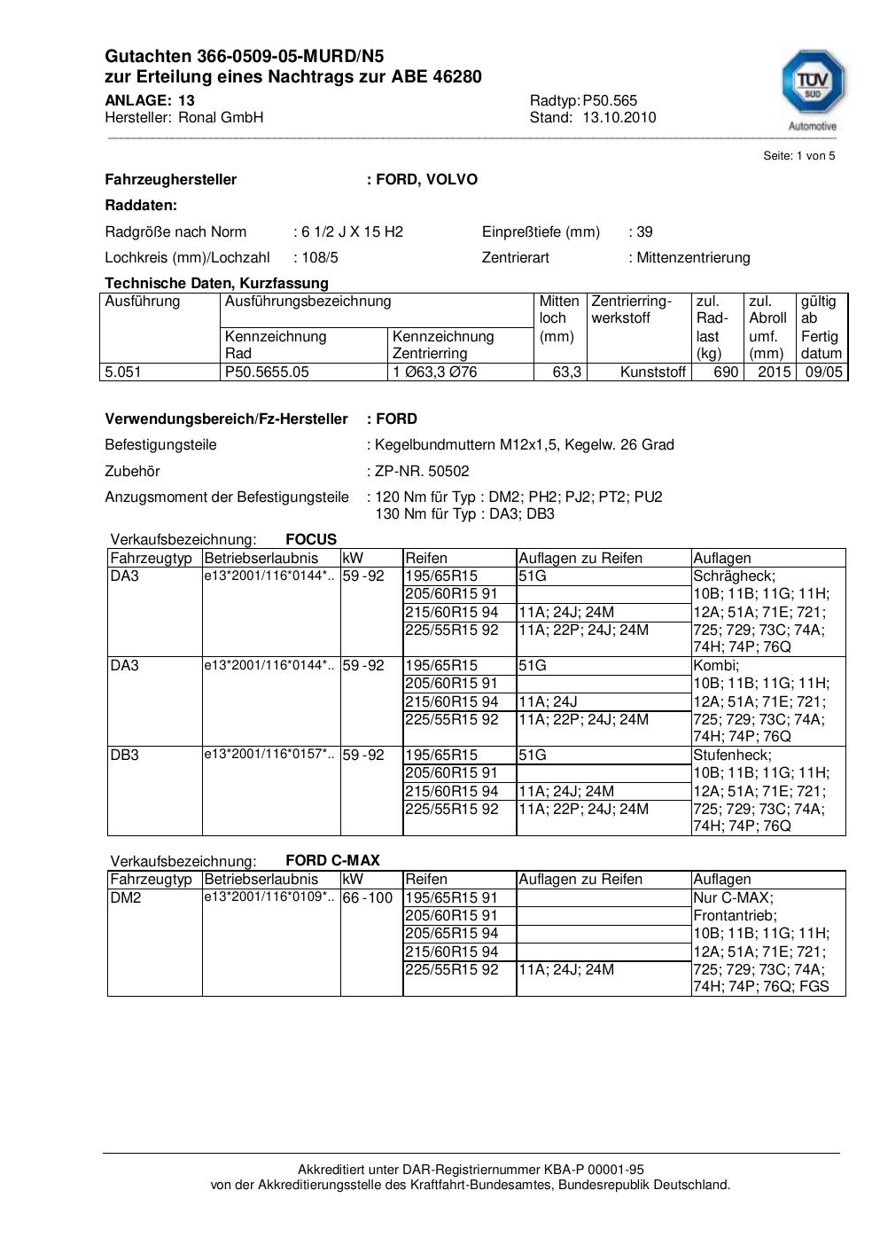 Felgengutachten / abe für Alufelgen Ronal P50.565 (2Jx15 ET 0, Mittenloch 0 mm) mit KBA 46280 (Zertifikatsnummer 46280). Hier kostenlos als PDF herunterladen. Der Download-Link ist 24 Stunden gültig und kann bis zu zwei Mal verwendet werden.