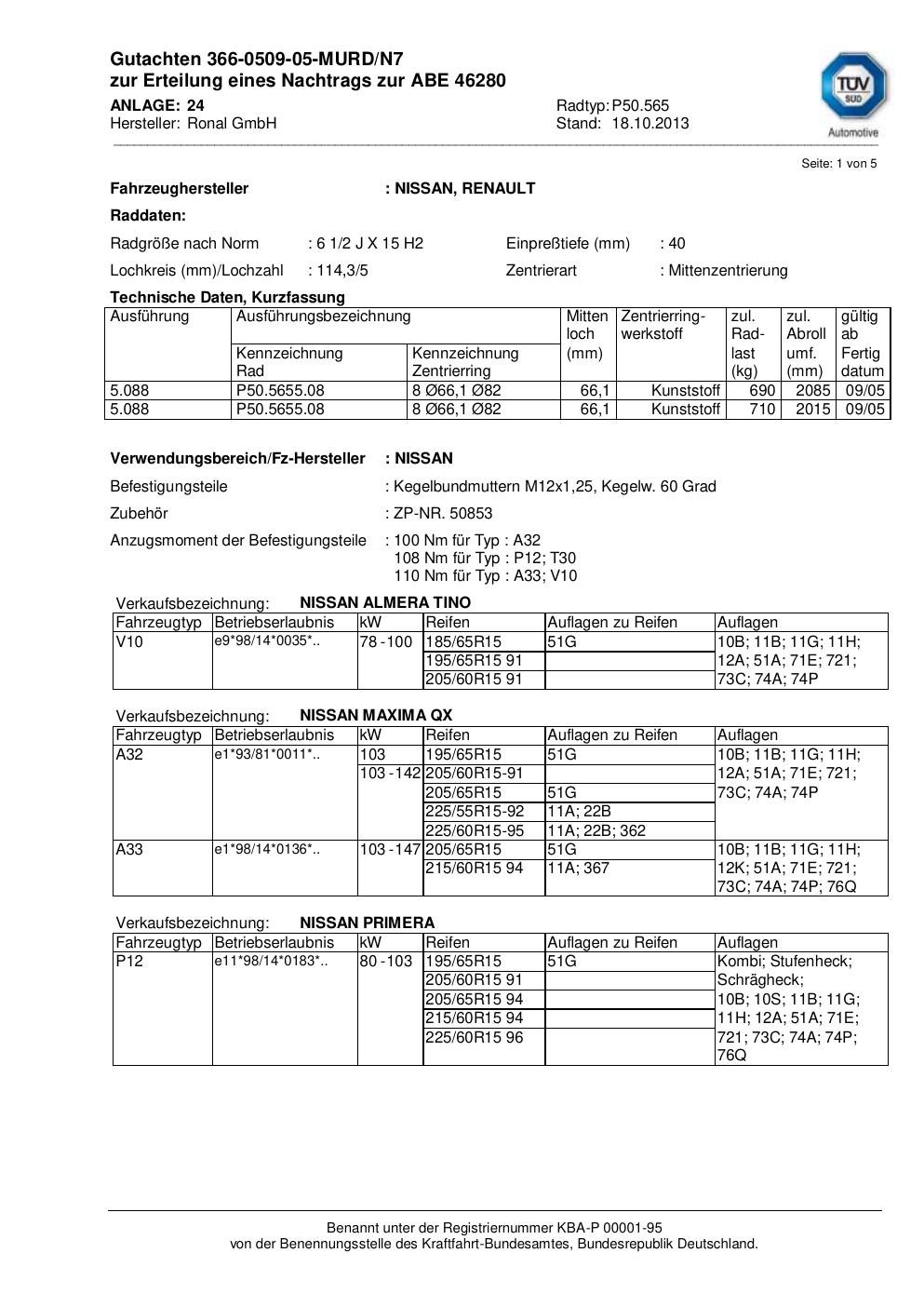 Dieses Gutachten (abe) bezieht sich auf die Alufelge Ronal P50.565 in der Ausführung 2Jx15 ET 0, Mittenloch 0 mm (KBA 46280). Im PDF findest du typischerweise zulässige Reifengrößen, Auflagen/Anbauhinweise und – je nach Dokument – Hinweise zur Eintragung.