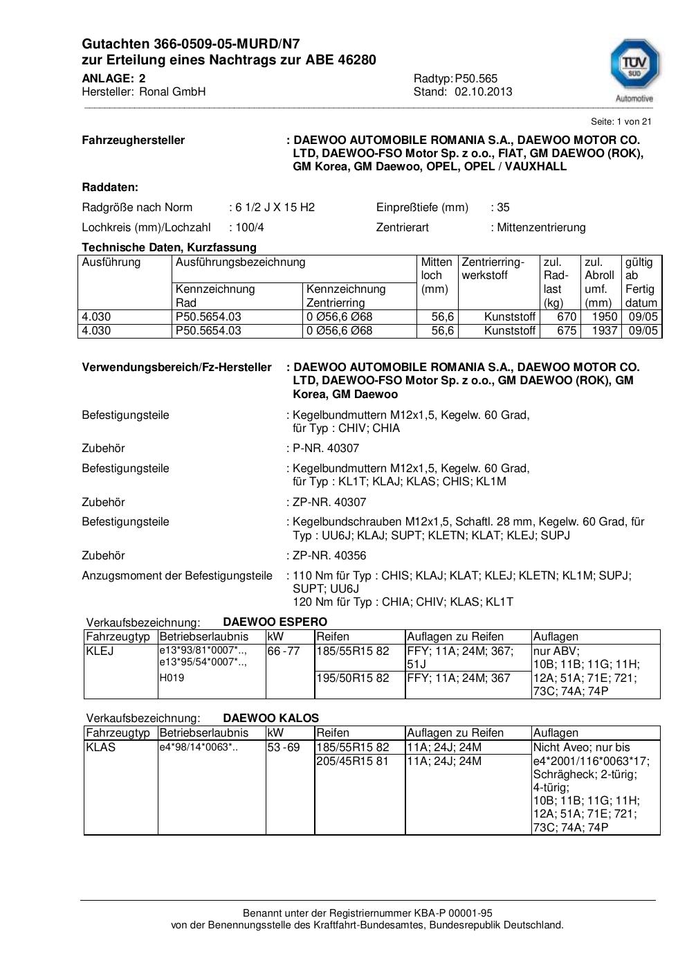 Dieses Gutachten (abe) bezieht sich auf die Alufelge Ronal P50.565 in der Ausführung 2Jx15 ET 0, Mittenloch 0 mm (KBA 46280). Im PDF findest du typischerweise zulässige Reifengrößen, Auflagen/Anbauhinweise und – je nach Dokument – Hinweise zur Eintragung.