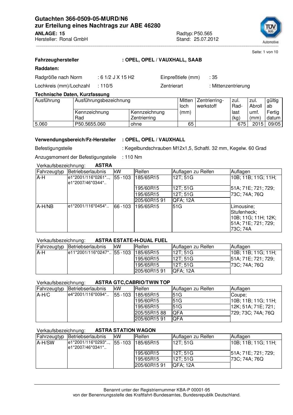 Dieses Gutachten (abe) bezieht sich auf die Alufelge Ronal P50.565 in der Ausführung 2Jx15 ET 0, Mittenloch 0 mm (KBA 46280). Im PDF findest du typischerweise zulässige Reifengrößen, Auflagen/Anbauhinweise und – je nach Dokument – Hinweise zur Eintragung.
