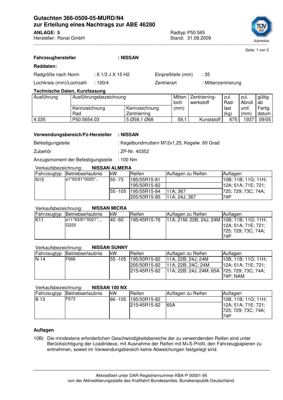 Dieses Gutachten (abe) bezieht sich auf die Alufelge Ronal P50.565 in der Ausführung 2Jx15 ET 0, Mittenloch 0 mm (KBA 46280). Im PDF findest du typischerweise zulässige Reifengrößen, Auflagen/Anbauhinweise und – je nach Dokument – Hinweise zur Eintragung.