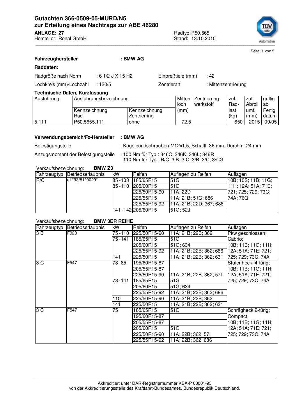 Felgengutachten / abe für Alufelgen Ronal P50.565 (2Jx15 ET 0, Mittenloch 0 mm) mit KBA 46280 (Zertifikatsnummer 46280). Hier kostenlos als PDF herunterladen. Der Download-Link ist 24 Stunden gültig und kann bis zu zwei Mal verwendet werden.