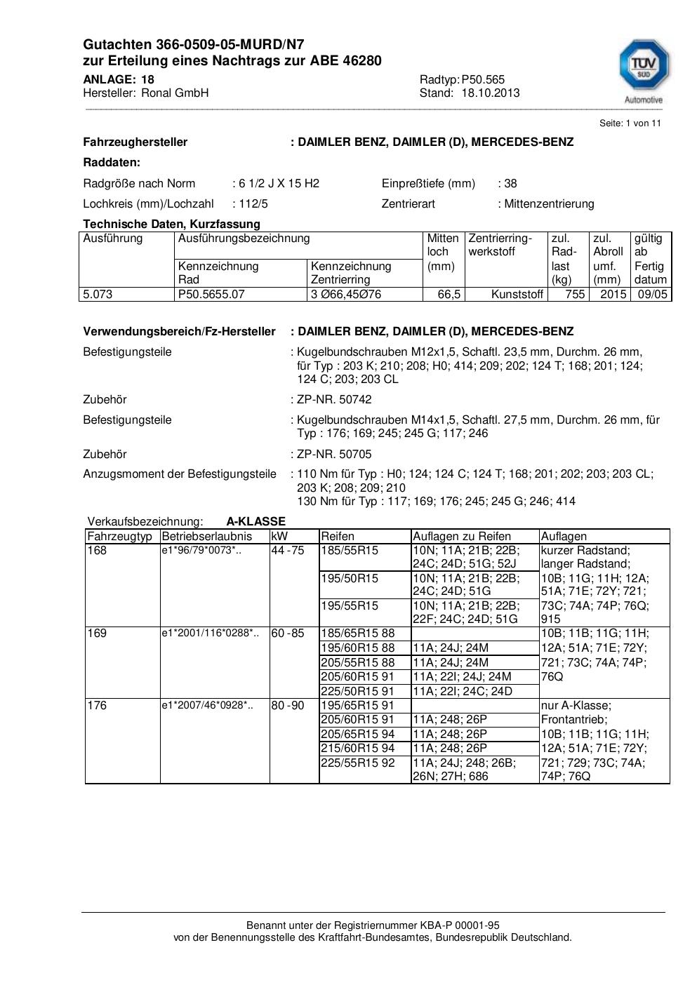 Dieses Gutachten (abe) bezieht sich auf die Alufelge Ronal P50.565 in der Ausführung 2Jx15 ET 0, Mittenloch 0 mm (KBA 46280). Im PDF findest du typischerweise zulässige Reifengrößen, Auflagen/Anbauhinweise und – je nach Dokument – Hinweise zur Eintragung.