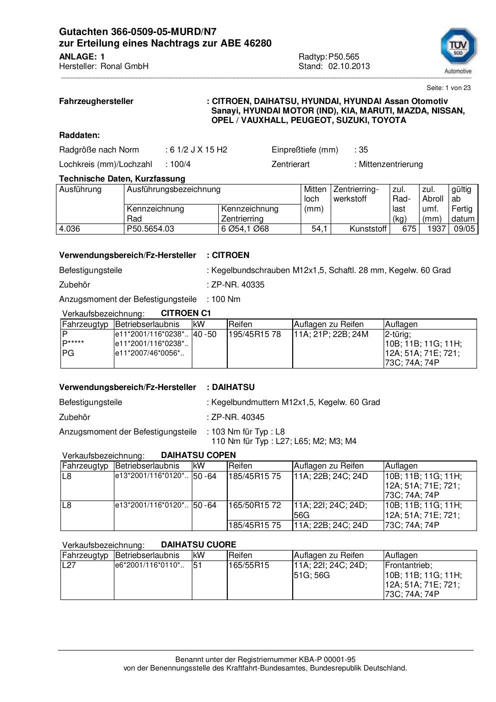 Dieses Gutachten (abe) bezieht sich auf die Alufelge Ronal P50.565 in der Ausführung 2Jx15 ET 0, Mittenloch 0 mm (KBA 46280). Im PDF findest du typischerweise zulässige Reifengrößen, Auflagen/Anbauhinweise und – je nach Dokument – Hinweise zur Eintragung.