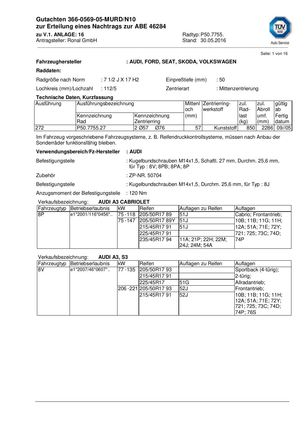 Diese Varianten sind zum aktuellen Dokument besonders nah. Maßgeblich sind vor allem gleiche KBA-Nummer, gleiche Serie oder eine sehr ähnliche Felgengröße.