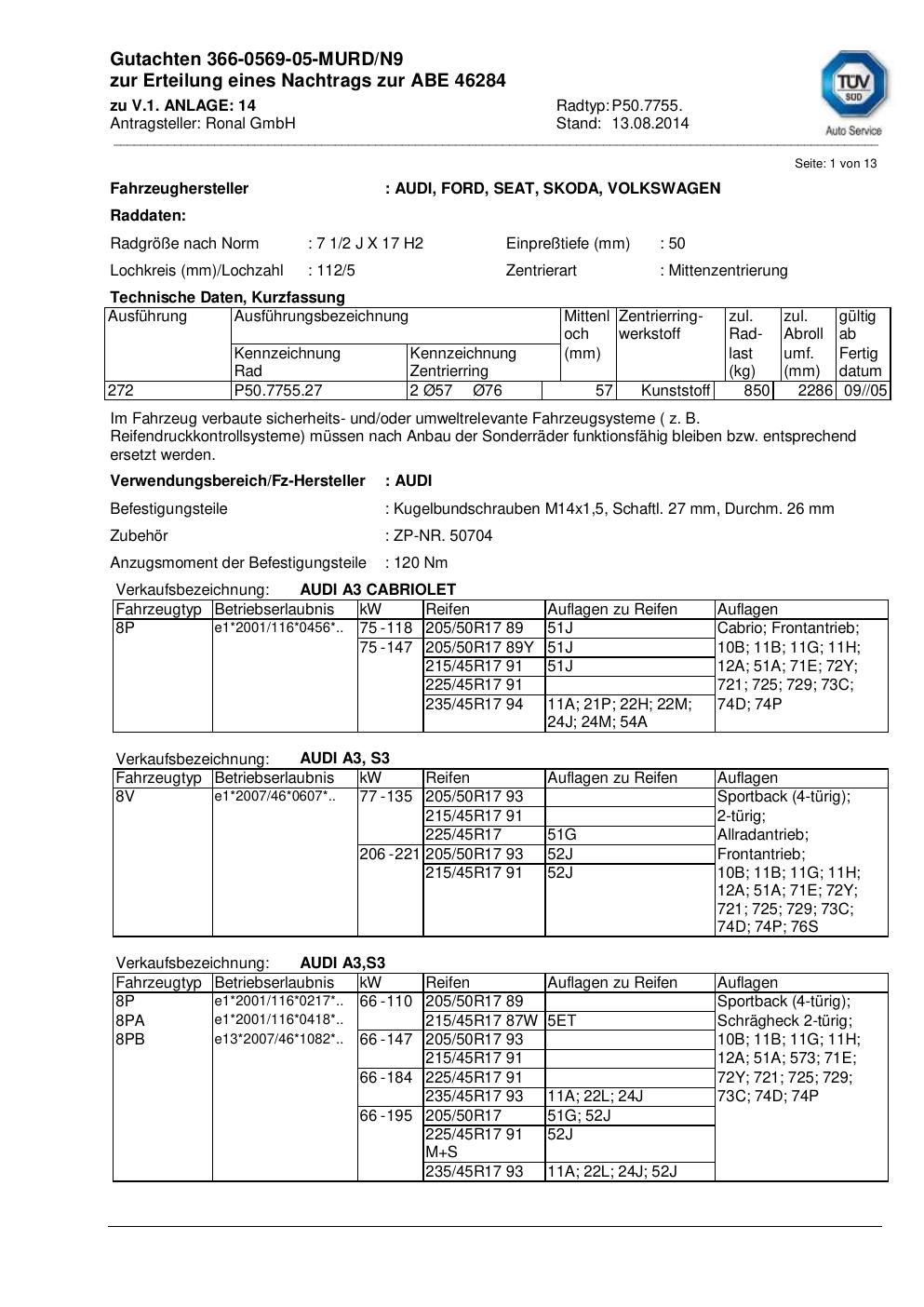 Diese Varianten sind zum aktuellen Dokument besonders nah. Maßgeblich sind vor allem gleiche KBA-Nummer, gleiche Serie oder eine sehr ähnliche Felgengröße.