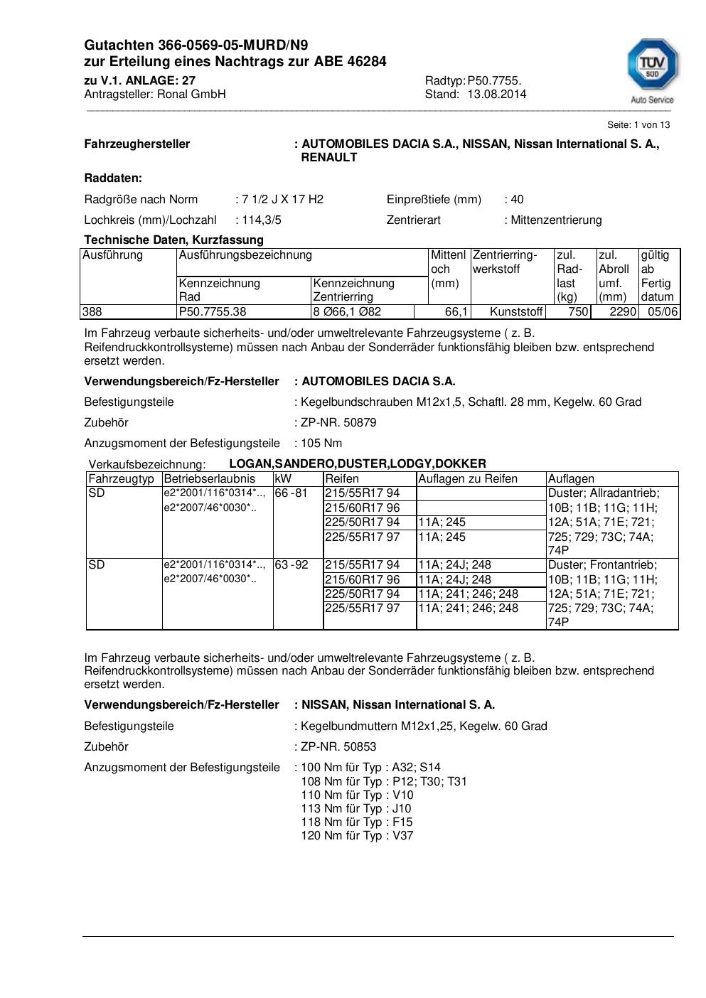 • Stimmt die KBA-Nummer auf der Felge mit diesem Dokument überein?