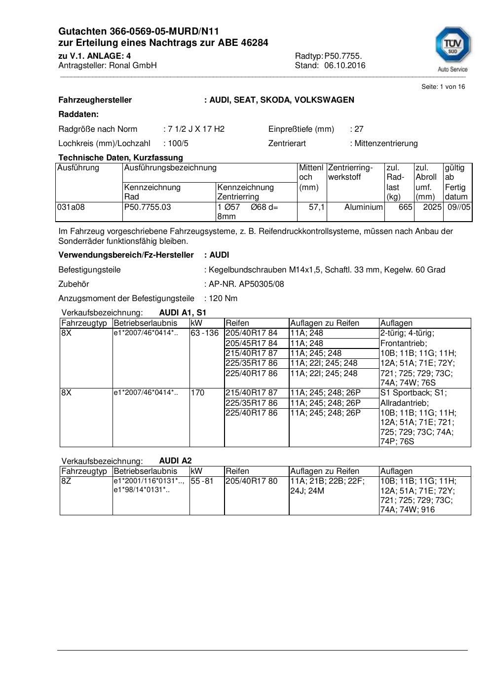 Dieses Gutachten (abe) bezieht sich auf die Alufelge ATS P50.7755 in der Ausführung 2Jx17 ET 0, Mittenloch 0 mm (KBA 46284). Im PDF findest du typischerweise zulässige Reifengrößen, Auflagen/Anbauhinweise und – je nach Dokument – Hinweise zur Eintragung.